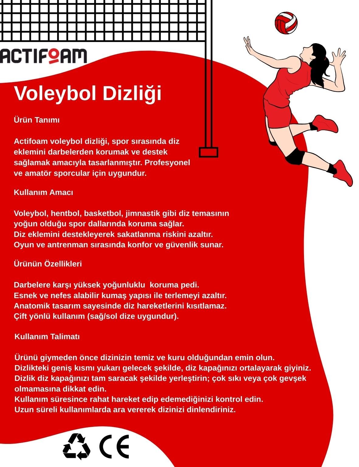 Actifoam voleybol dizliği, spor sırasında diz eklemini darbelerden korumak ve destek sağlamak amacıyla tasarlanmıştır. Profesyonel ve amatör sporcular için uygundur.