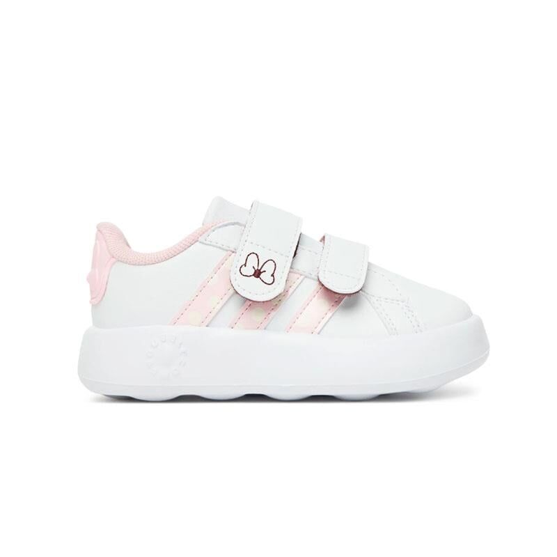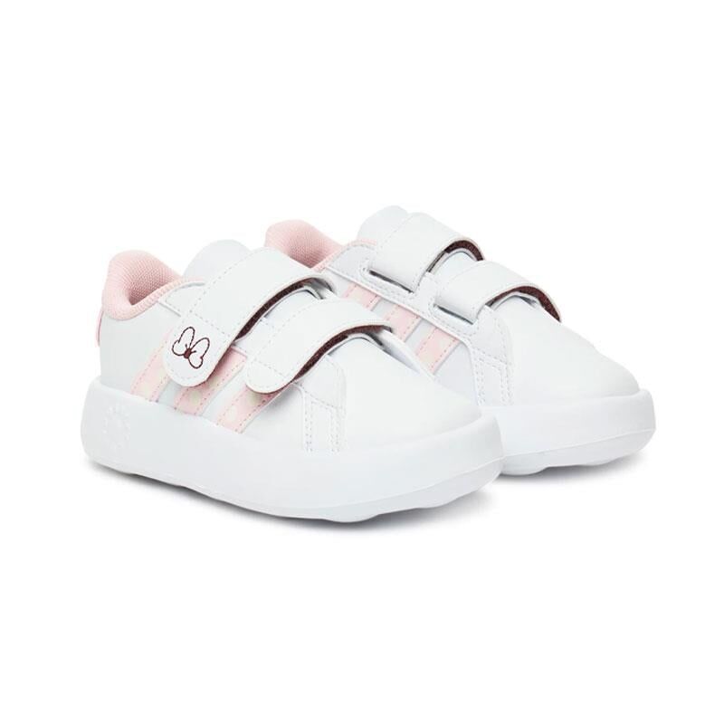 Adidas Grand Court Minnie CF I Çocuk Günlük Ayakkabı JR8130, Disney’in sevilen karakteri Minnie Mouse’tan ilham alan zarif tasarımıyla öne çıkıyor. Beyaz zemin üzerine açık pembe 3 bant ve bordo kontur detayları, hem sade hem eğlenceli bir görünüm kazandırır. Cırt cırt bantlı yapısı, minik kullanıcılar için kolay giyme ve çıkarma imkânı sunar.