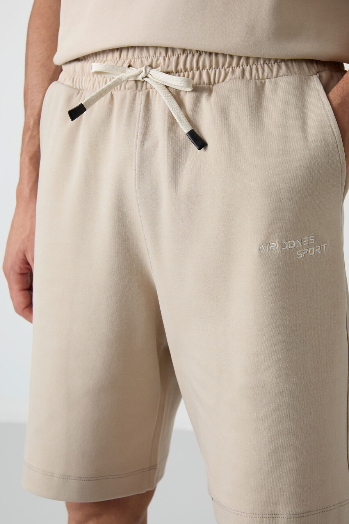 Bej Pamuklu Kalın Yumuşak Dokulu Oversize Fit Nakışlı Erkek Şort Takım - 85250