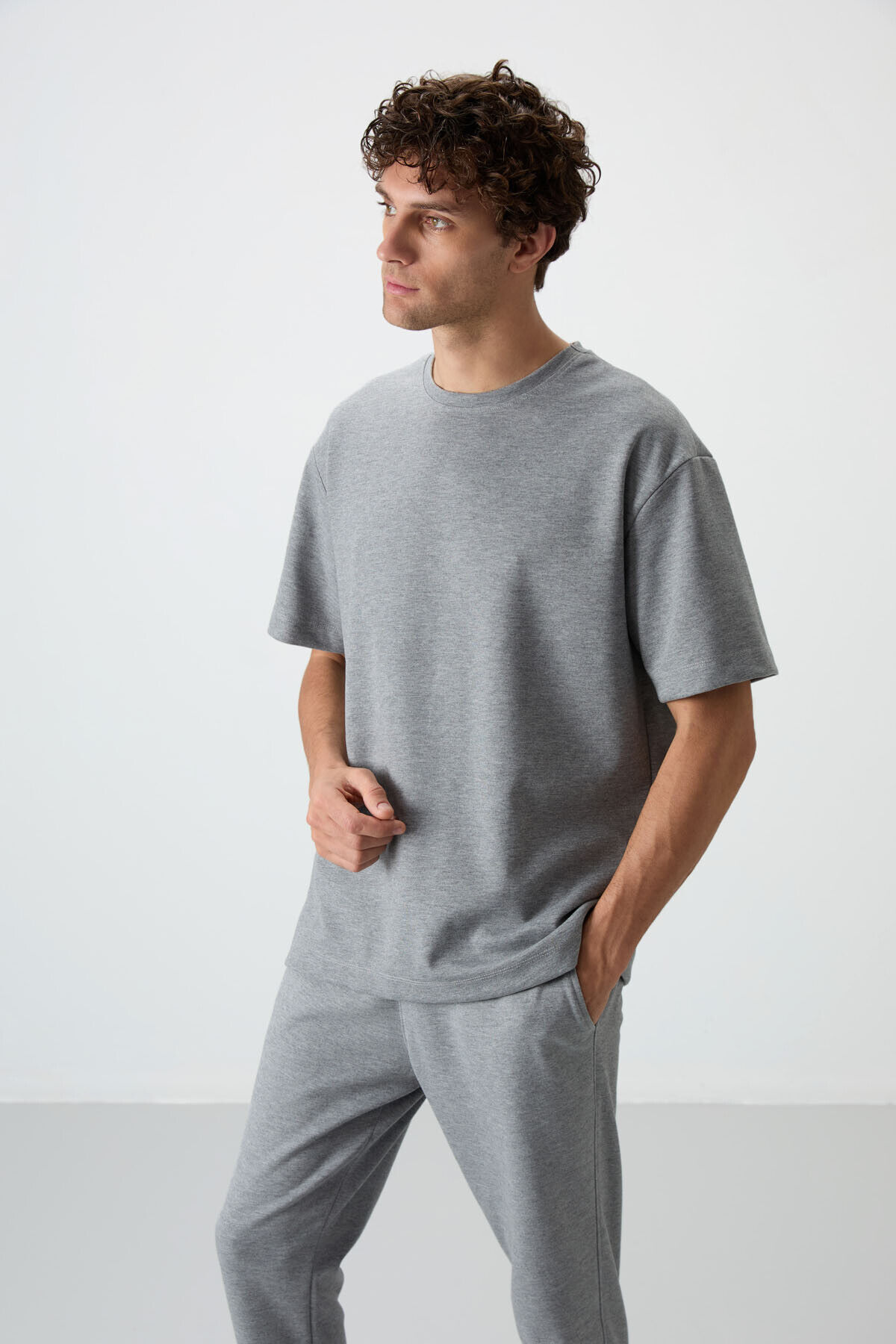 Air Jones Gri Melanj Pamuklu Kalın Yumuşak Dokulu Oversize Fit Basic Erkek Eşofman Takım - 85251