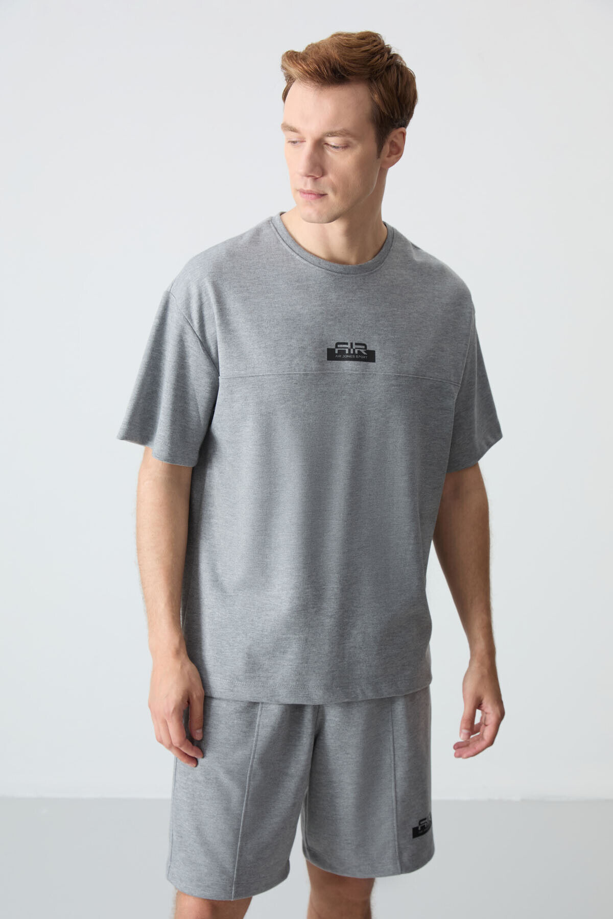 Gri Melanj Pamuklu Kalın Yumuşak Dokulu Oversize Fit Basic Erkek Şort Takım - 85259