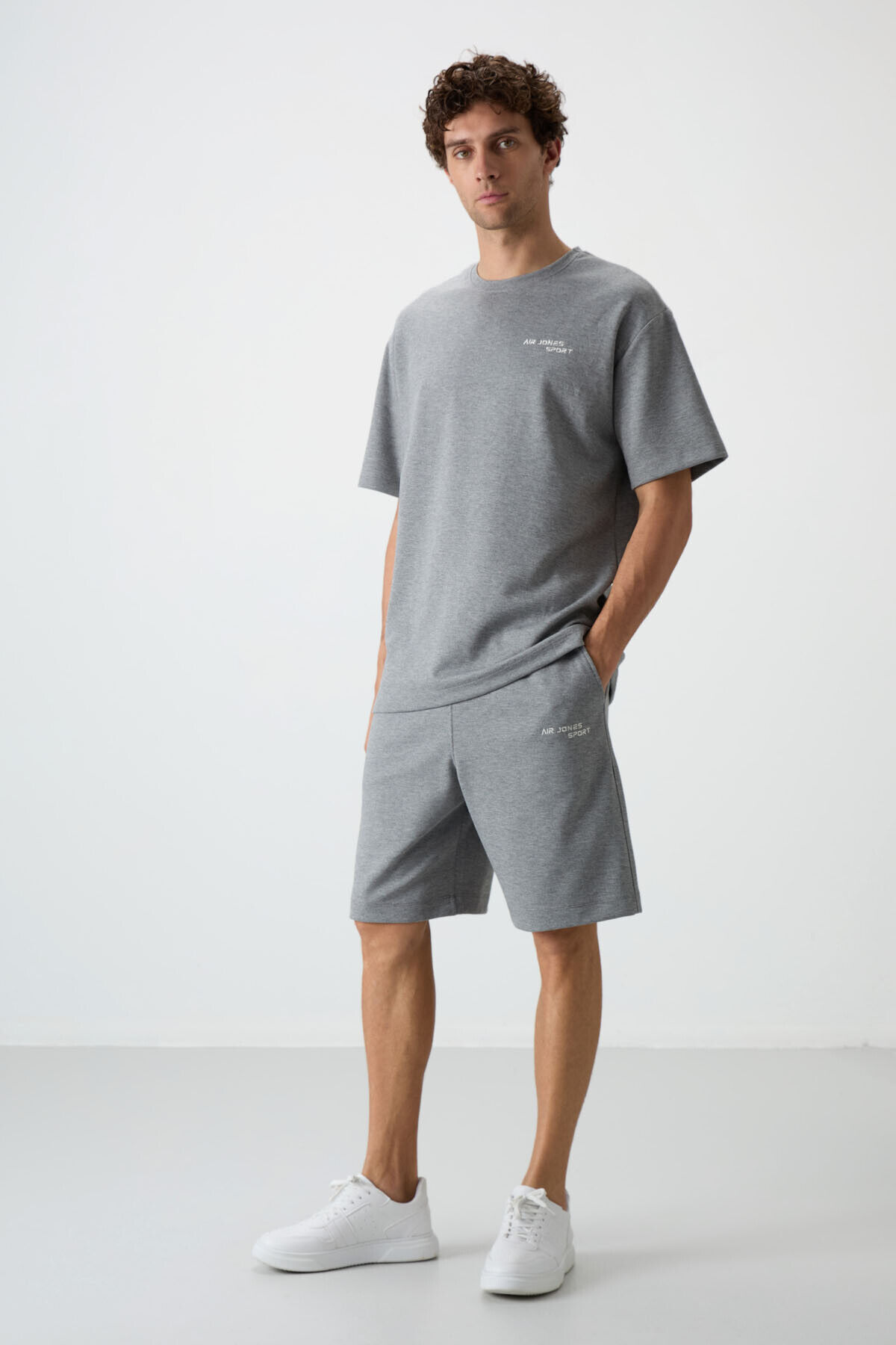 Gri Melanj Pamuklu Kalın Yumuşak Dokulu Oversize Fit Nakışlı Erkek Şort Takım - 85250