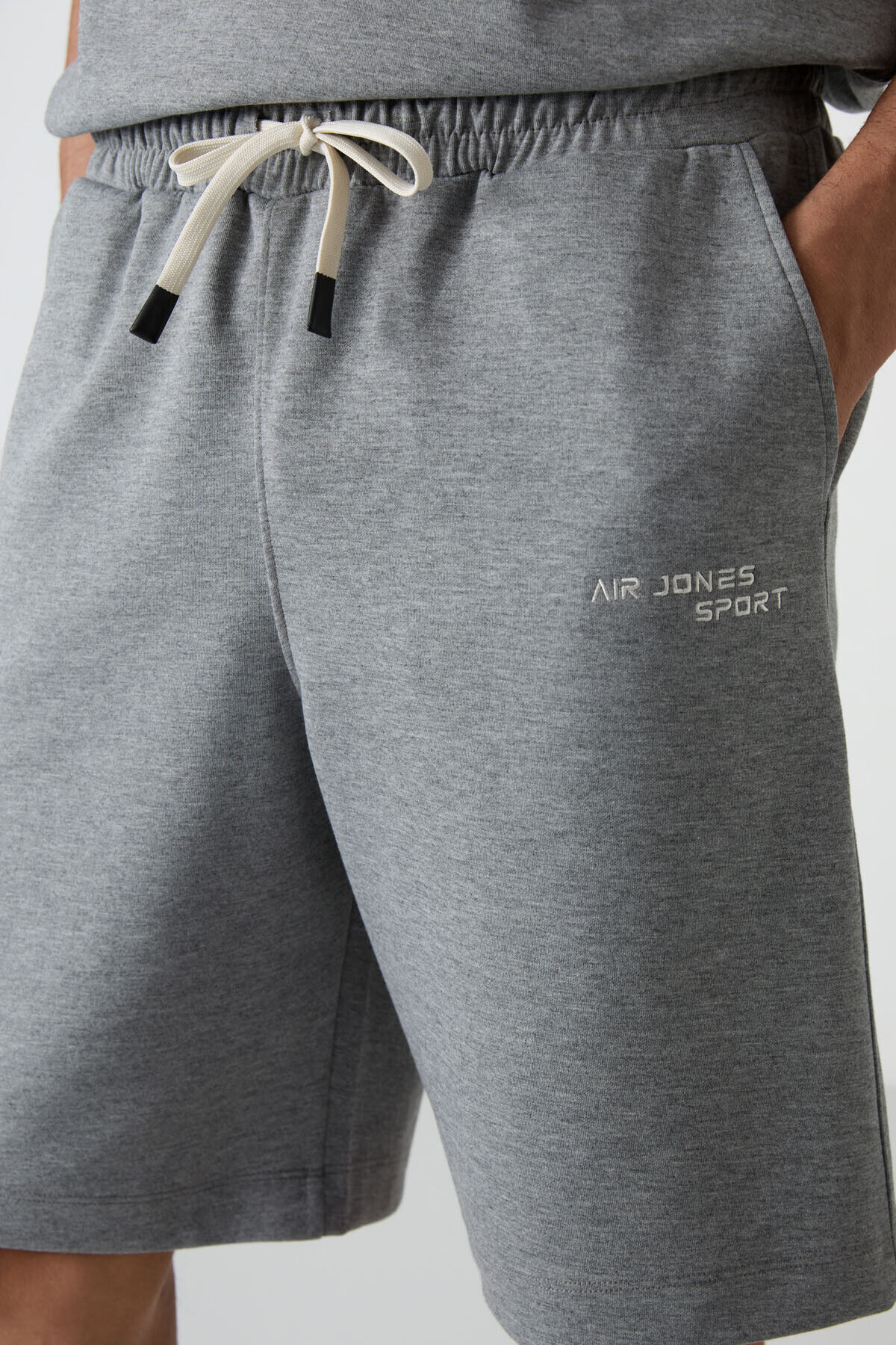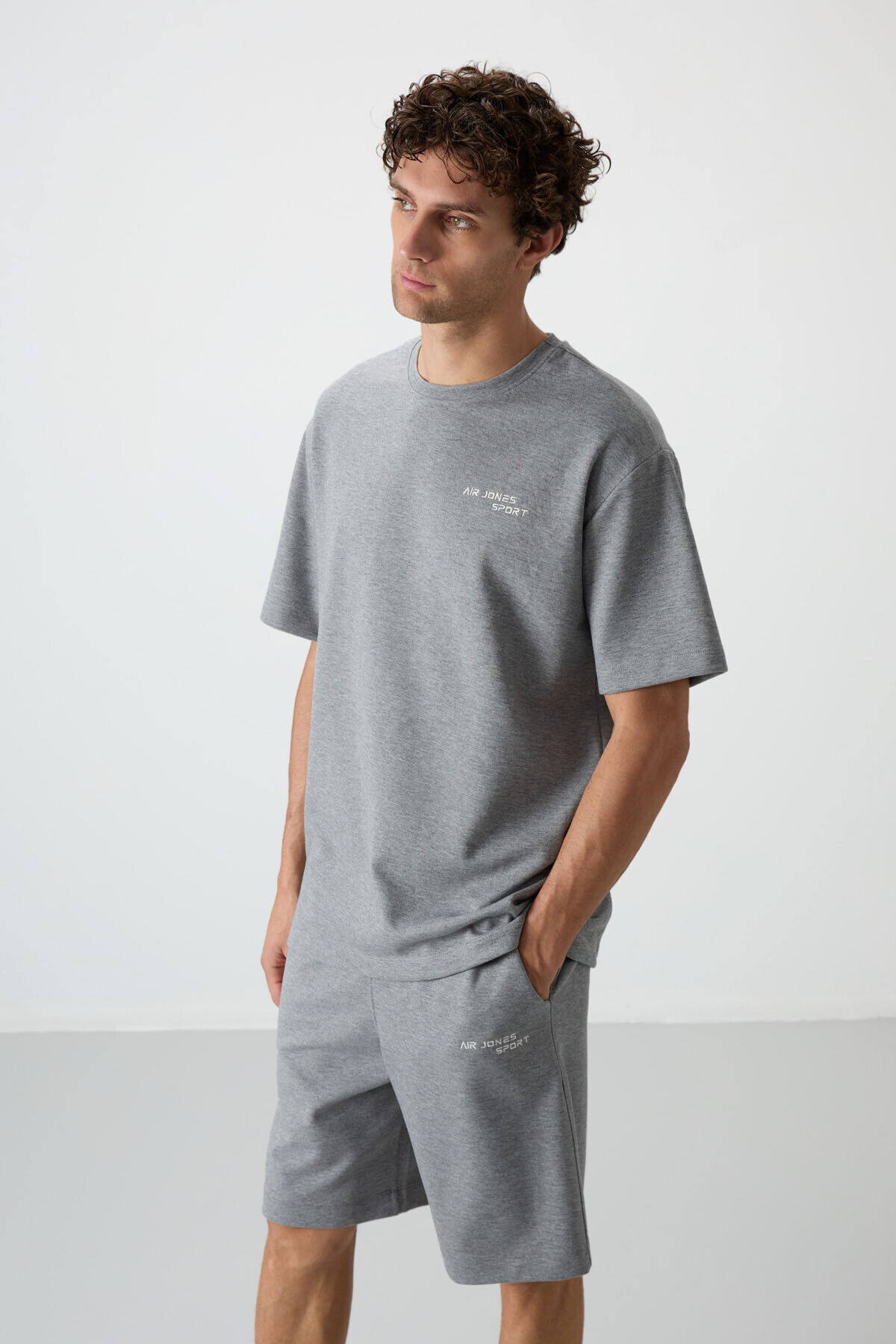 Air Jones Gri Melanj Pamuklu Kalın Yumuşak Dokulu Oversize Fit Nakışlı Erkek Şort Takım - 85250