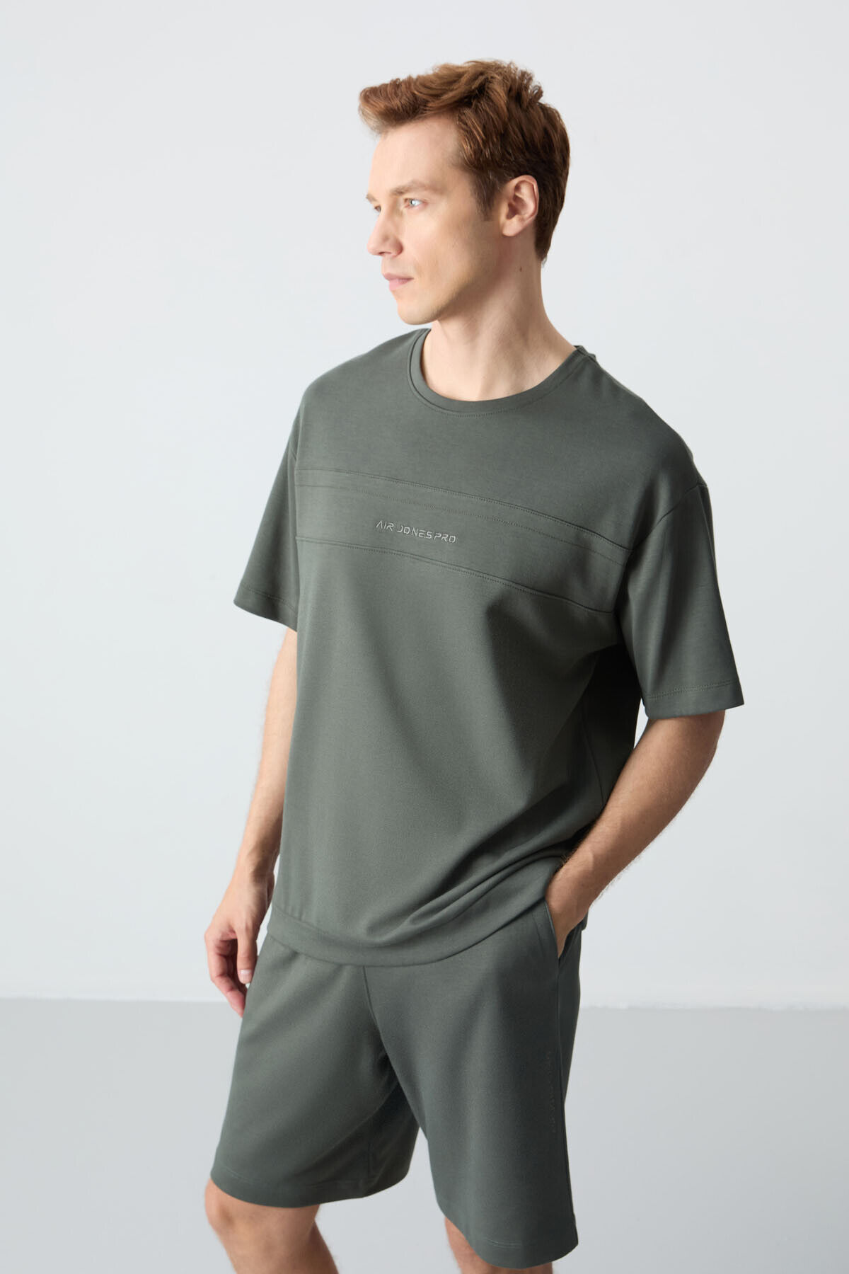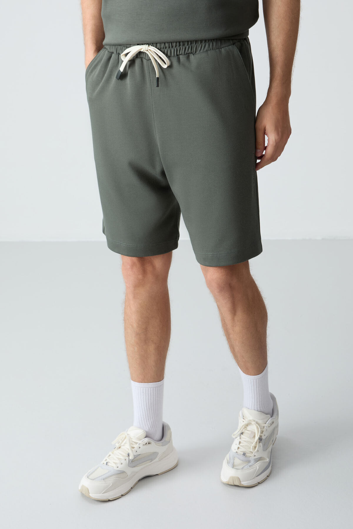 Haki Pamuklu Kalın Yumuşak Dokulu Oversize Fit Basic Erkek Şort Takım - 85257