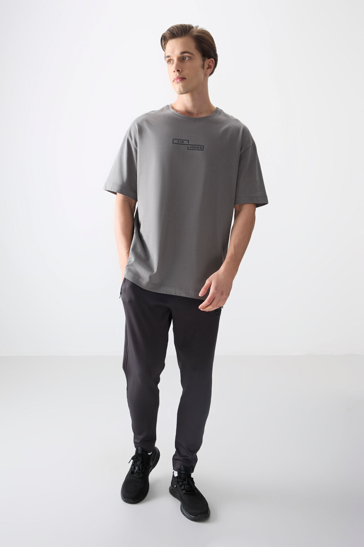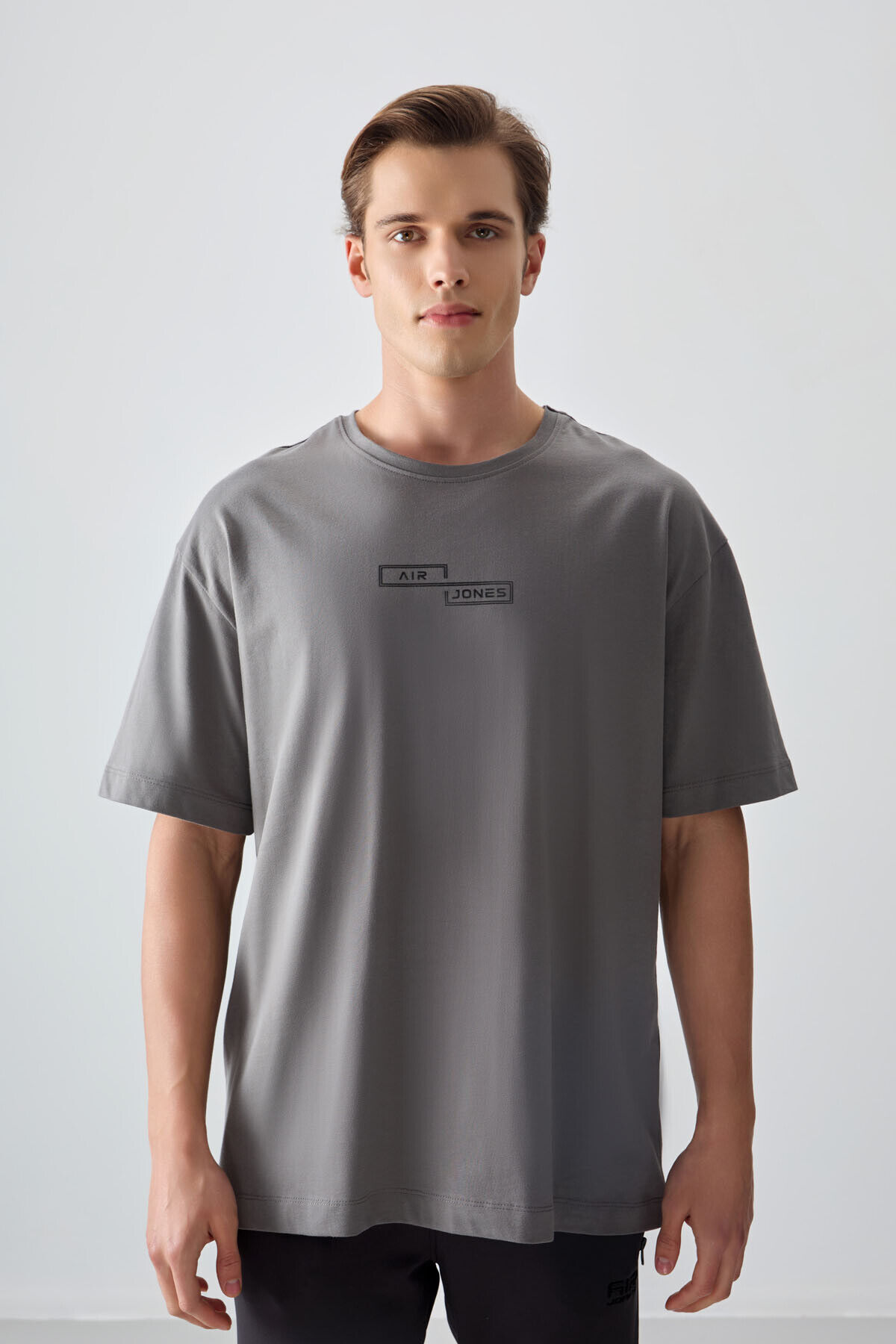 Air Jones Koyu Gri %100 Pamuk Kalın Yumuşak Dokulu Oversize Fit Baskılı Erkek T-Shirt - 88361