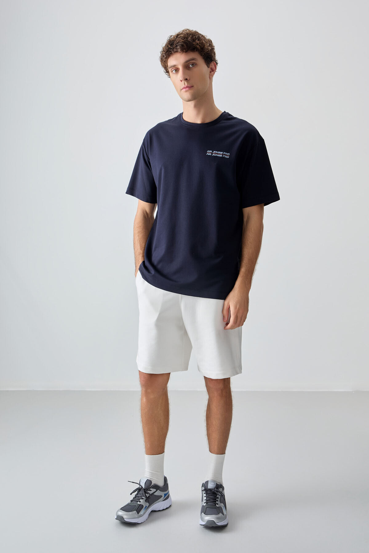 Air Jones Lacivert Pamuklu Kalın Yumuşak Dokulu Oversize Fit Baskılı Erkek T-Shirt - 88375
