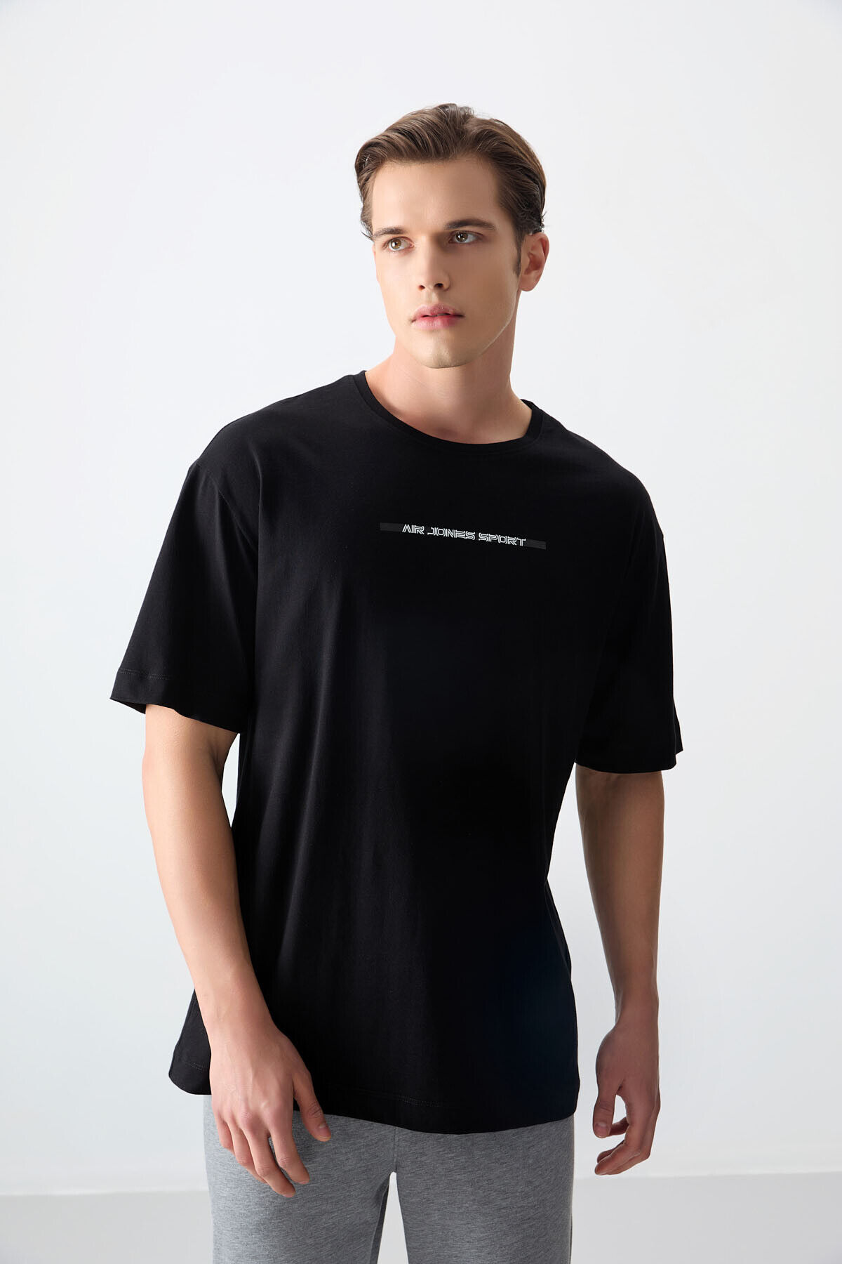 Air Jones Siyah %100 Pamuk Kalın Yumuşak Dokulu Oversize Fit Baskılı Erkek T-Shirt - 88358