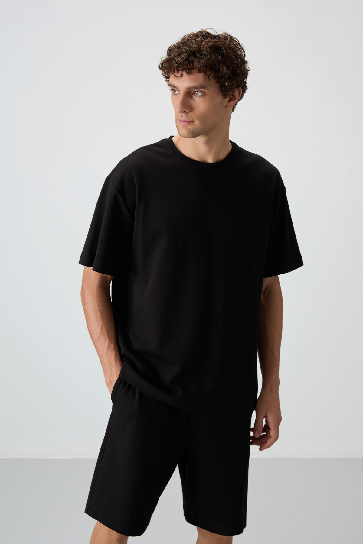 Siyah Pamuklu Kalın Yumuşak Dokulu Oversize Fit Basic Erkek Şort Takım - 85249