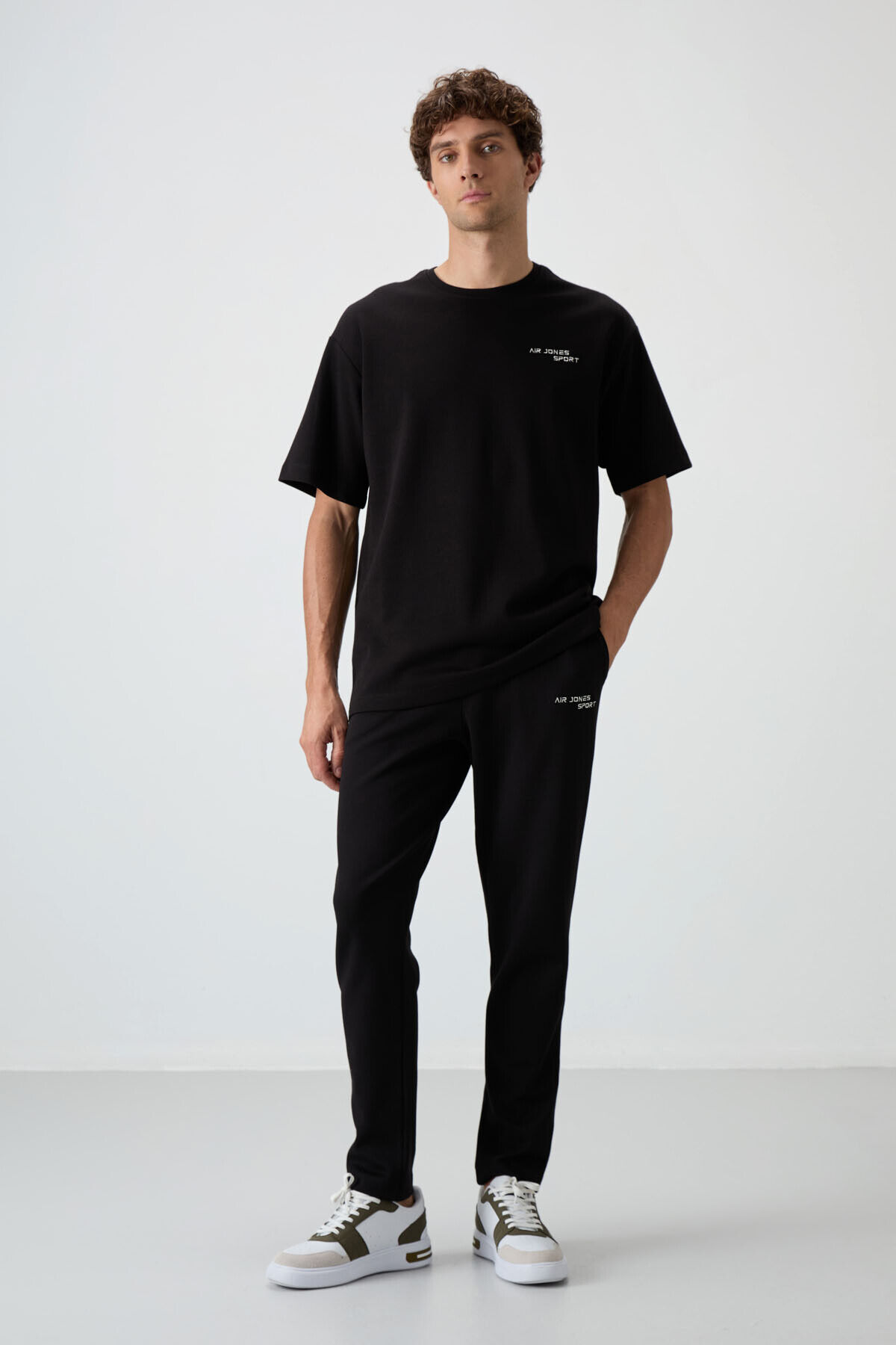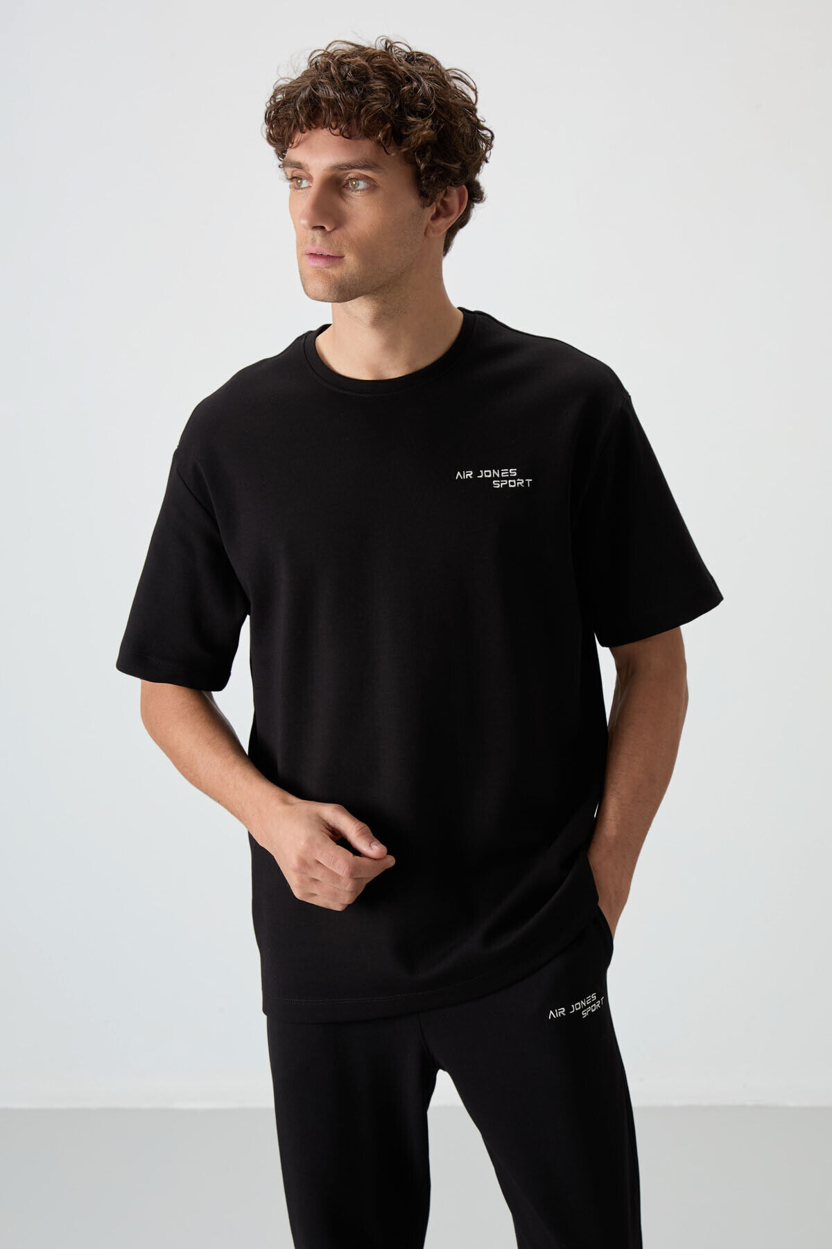Siyah Pamuklu Kalın Yumuşak Dokulu Oversize Fit Nakışlı Erkek Eşofman Takım - 85252