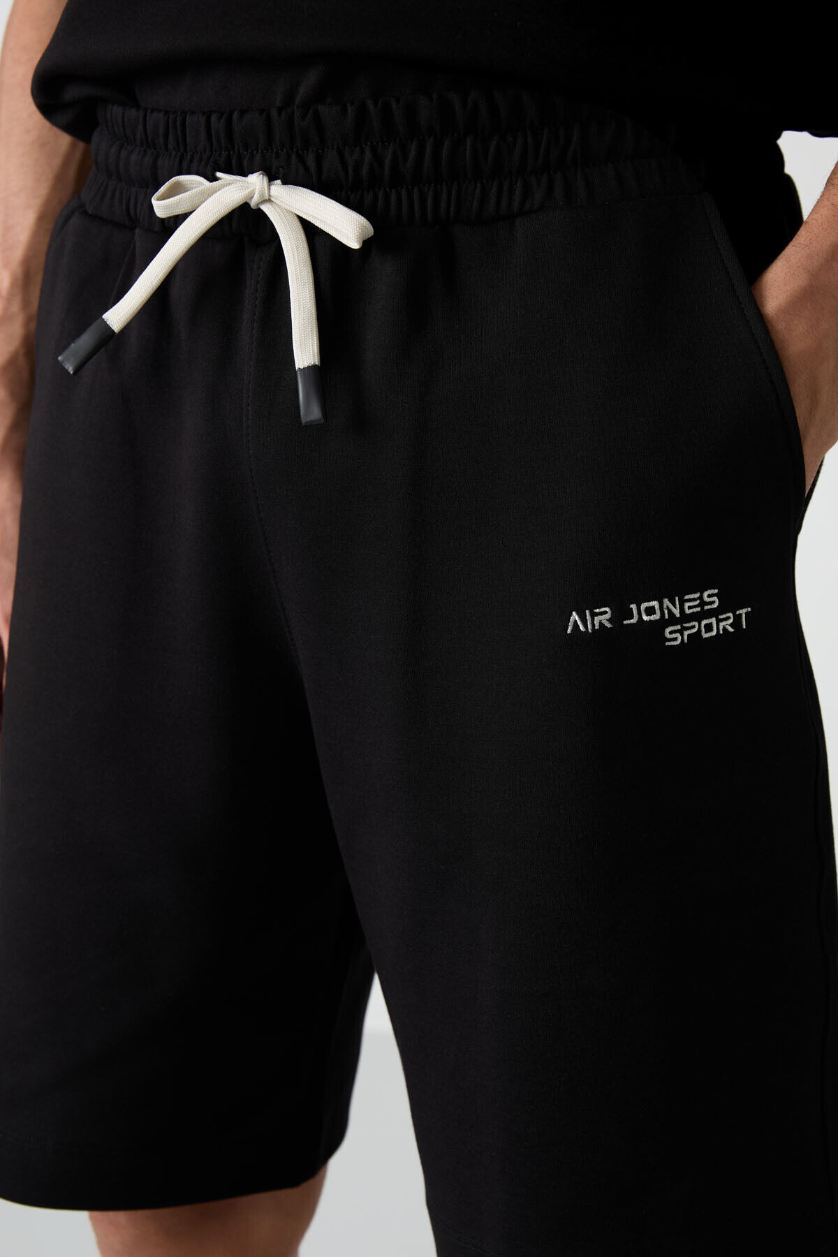 Siyah Pamuklu Kalın Yumuşak Dokulu Oversize Fit Nakışlı Erkek Şort Takım - 85250
