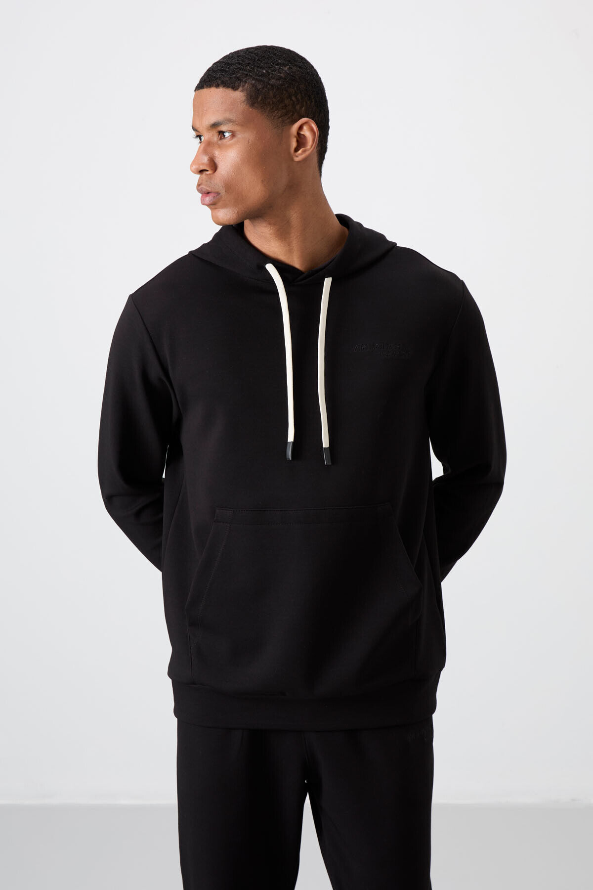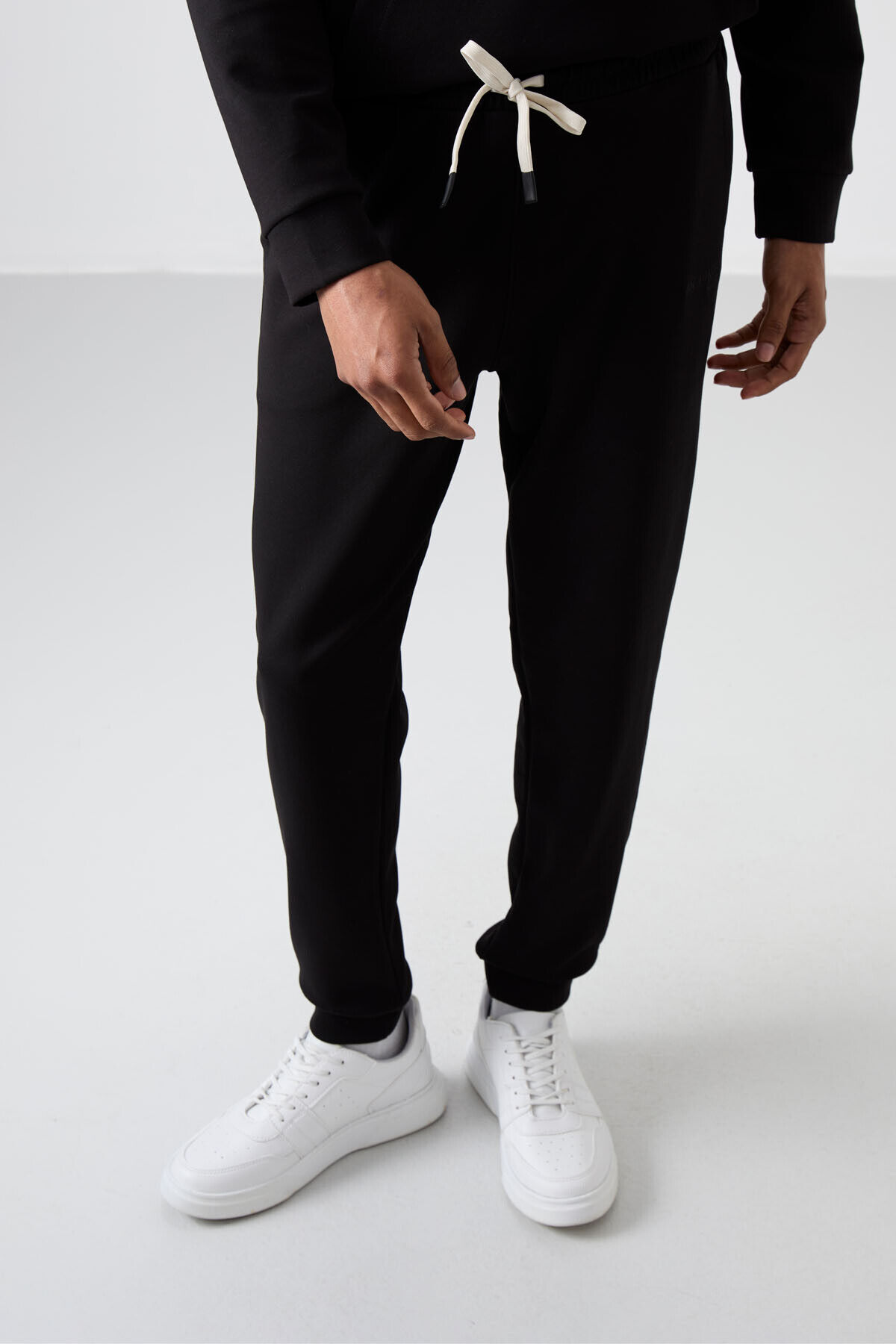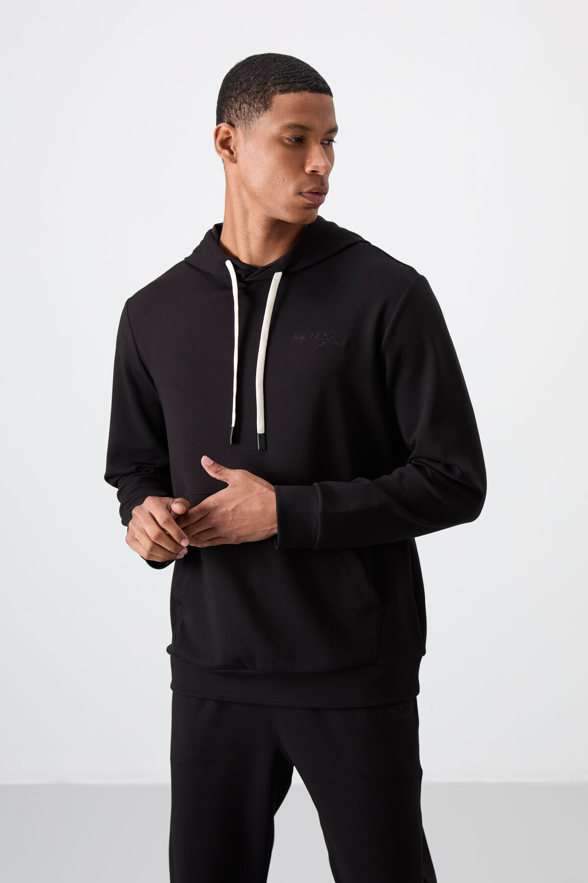 Siyah - Siyah Pamuklu Kalın Yumuşak Dokulu Comfort Fit Nakışlı Erkek Eşofman Takım - 85255