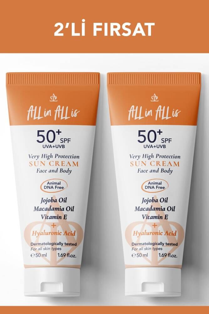 All in All is SPF 50+ Güneş Koruyucu Krem 2 Adet Güçlü formülü ve içerdiği aktiflerle cildinizi korur, hissedilir derecede nemlendirir ve besler. ; Tüm cilt tipleri için dört mevsim kullanıma uygundur. ; İÇİNDEKİLER VE ETKİLERİ Jojoba Yağı Macadamia Yağı (Avustralya Fındığı Yağı) E Vitamini Hyalüronik Asit Sesamun Indicum (Susam Yağı ) Calendula (Aynısafa Bitkisi) Rüşeym Yağı Chamomilla Çiçeği Özü Allantoin Zea Mays (Huile de Mais) Phantenol Shea Yağı;