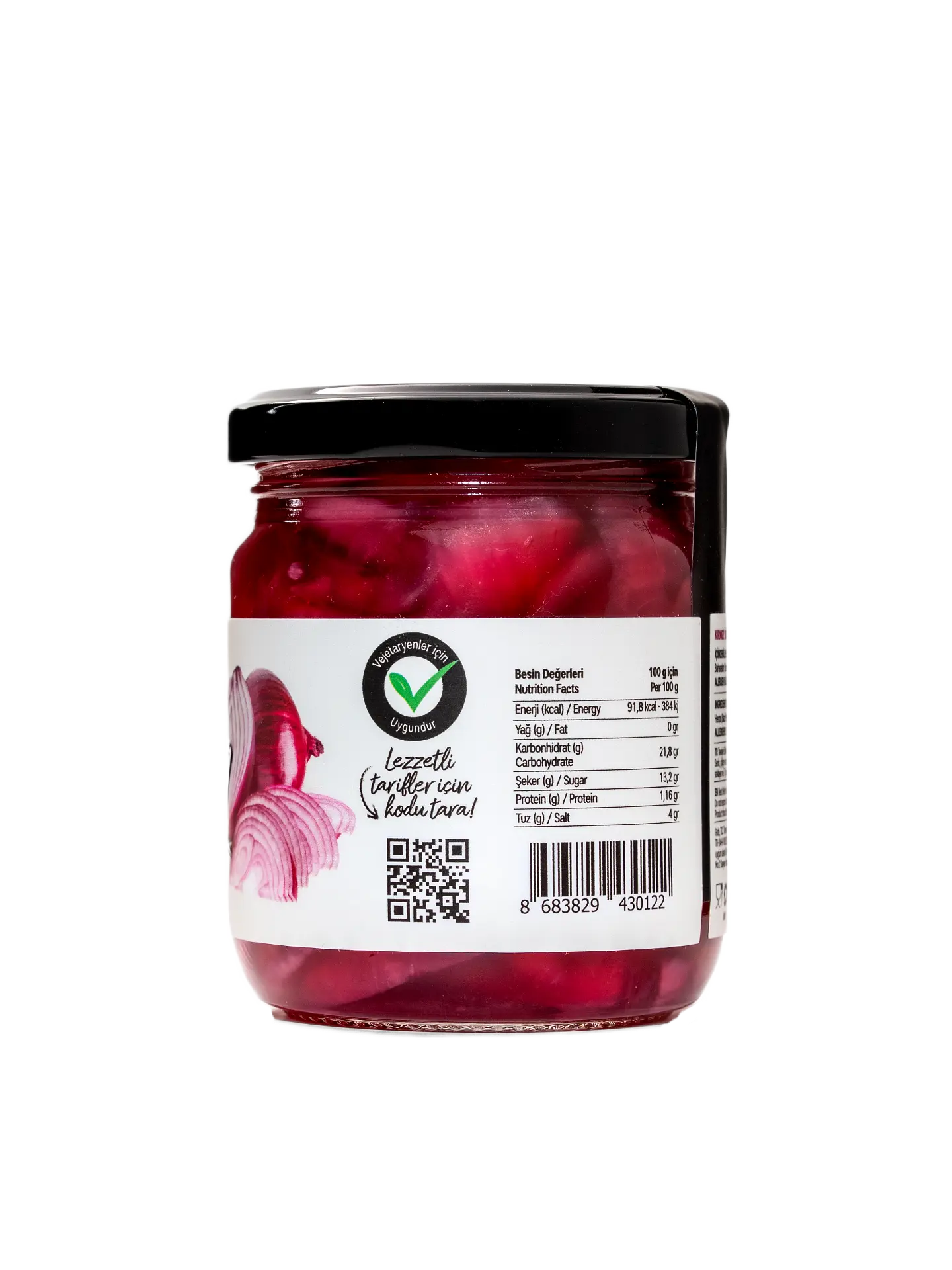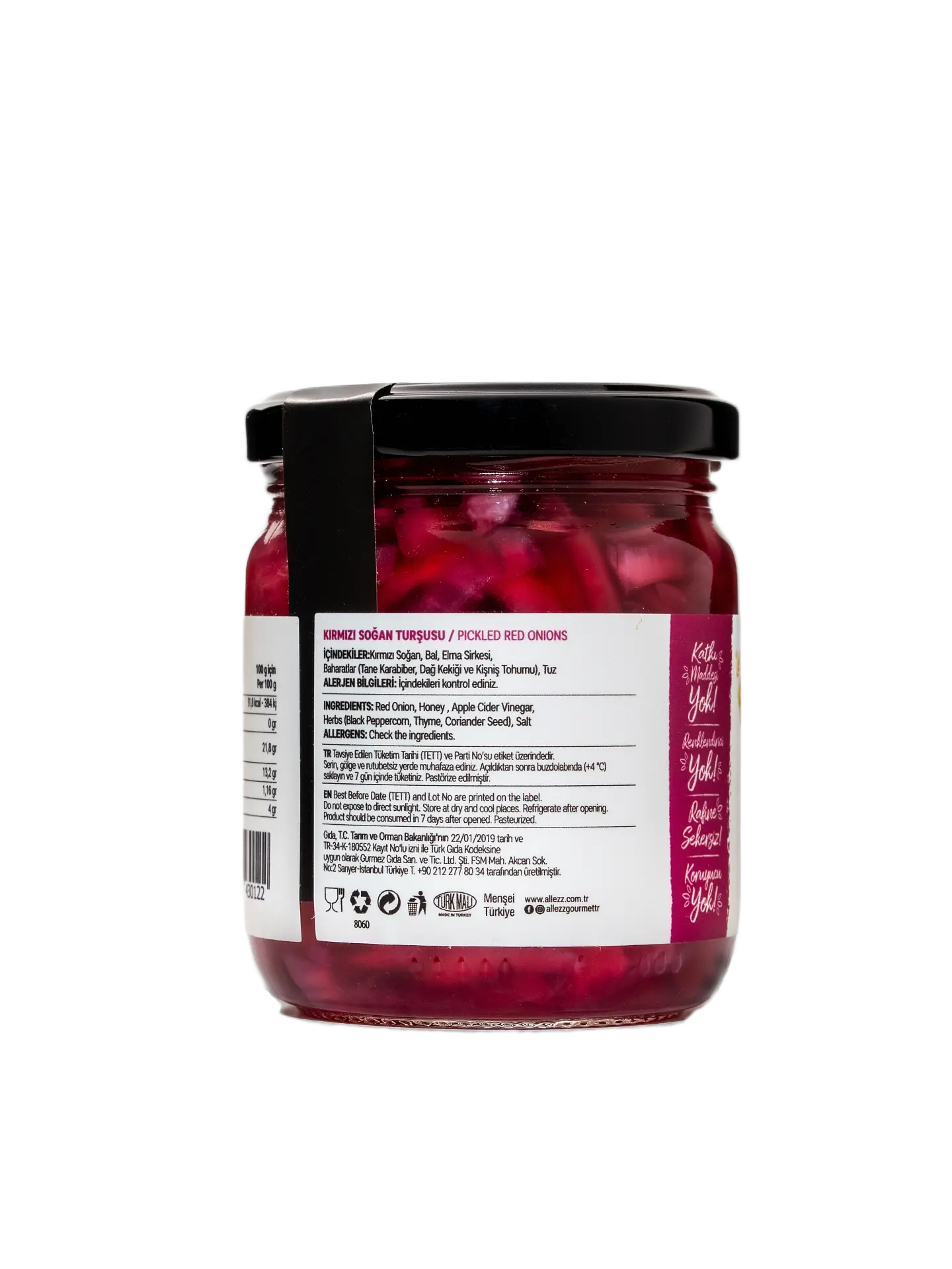 ÜRÜNÜN TANIMI: Kırmızı soğan, elma sirkesi, bal, tane kişniş, tane karabiber, top kekik ve tuz ile hazırlanan, Kırmızı Soğan Turşusu ürünüdür. Tamamen doğal, katkısız, koruyucu madde içermeyen, rafine şeker veya yapay tatlandırıcı ve renklendirici içermeyen, şef mantığı ile üretilen gurme üründür. Tamamen vejetaryendir. Glutensizdir. Fast food yemekler, deniz ürünleri, şarküteriler, kahvaltı ve brunch yemekleri ile mükemmel uyumlu bir lezzet.
