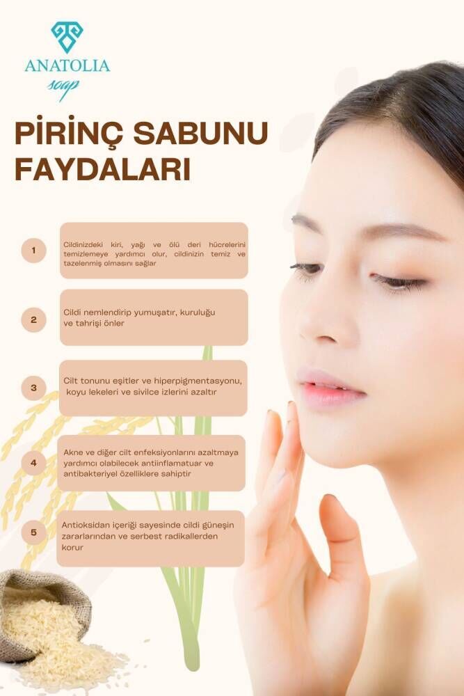 Pirinç sabununun içerisindeki bileşenlerin cildi beyazlatıcı etkisi vardır; Yüzünüzde sağlıklı bir ışıltı bırakır; Yüzünüzde sağlıklı bir ışıltı bırakır; Düzenli olarak kullanıldığında cildinizdeki renk bozukluğunun düzelmesine yardımcı olur; Yüzünüzdeki yara izlerini ve diğer koyu renk lekelerin renginin açılmasına ve daha soluk görünmelerine katkı sağlar; İyi bir cilt nemlendirme ürünüdür; ;;