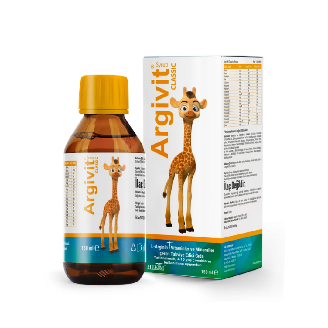 Argivit Şurup ailemizin ilk bireyi vitamin (A vitamini, B1 vitamini, B2 vitamini, B3 vitamini, B5 vitamini, B6 vitamini, B11 vitamini, B12 vitamini, C vitamini, D vitamini, E vitamini, H vitamini ve L-arginin) ve mineral (Çinko, Selenyum, Manganez, Krom, Molibden ve İyot) kombinasyonu içeren bir gıda takviyesidir.