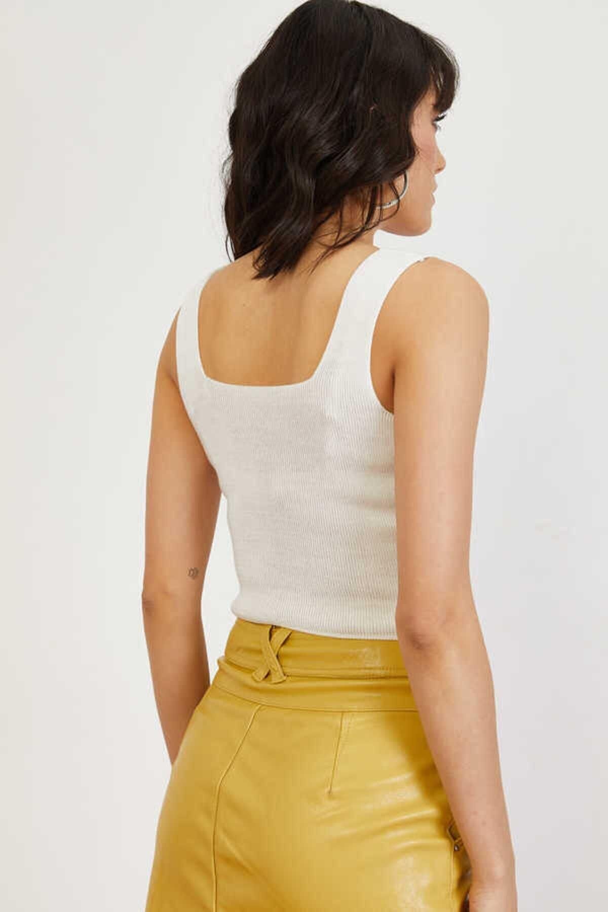 As Collection Beyaz Kare Yaka Likralı Fit Triko Kadın Crop Bluz
