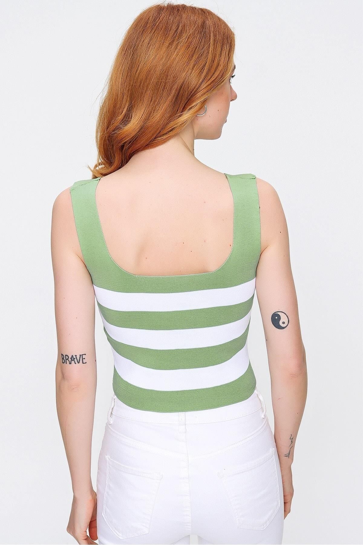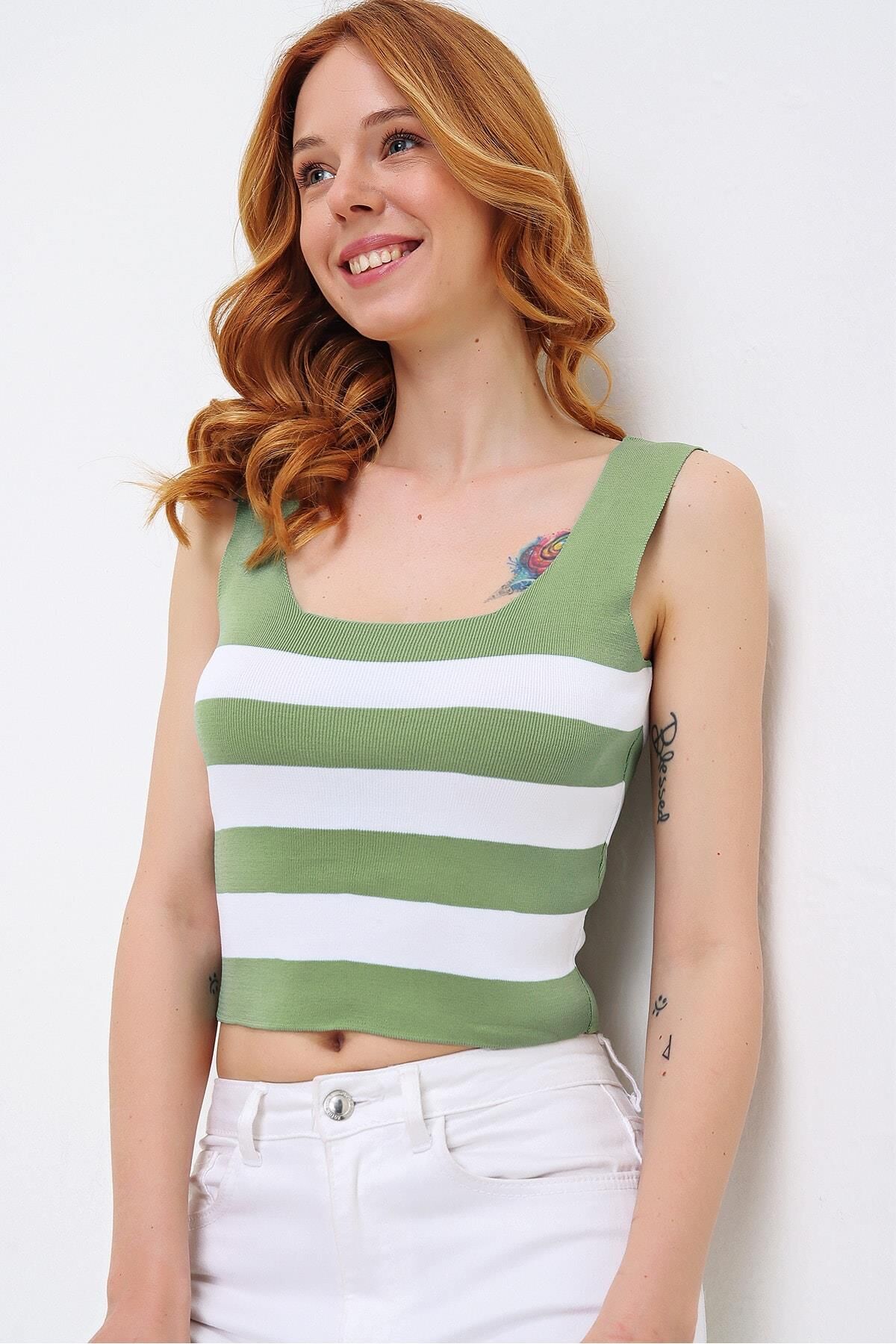 Şıklık ve rahatlığı bir arada sunan As Collection Yeşil Kalın Askılı Kare Yaka Çizgili Kadın Bluz, gardırobunuzun vazgeçilmezi olmaya aday.