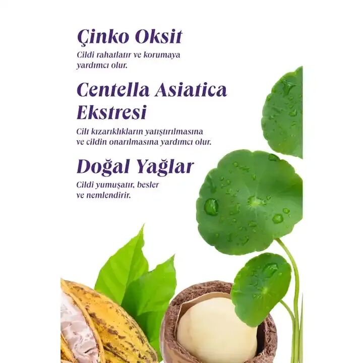 • Doğal Yağlar : Kakao ve shea yağları ile zeytinyağı sayesinde cildi yumuşatır; derinlemesine besler ve pürüzsüz doku sağlar.