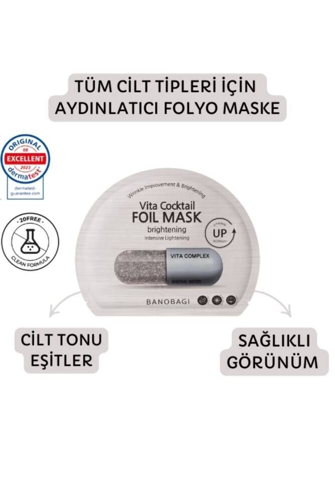 Banobagi'den Vita Cocktail Aqua Foil Mask, yüz bakımı için özel bir ürün serisinin parçasıdır.; Kullanımı kolaydır ancak mükemmel bir gençleştirici ve ferahlatıcı etki sağlar.; Folyo malzemeden yapılmış birinci sınıf bir maskedir.; Bu maske cilt yüzeyine mükemmel bir yapışma sağlayarak nemlendirici özün buharlaşmasını önler ve maddelerin cilde emilimini artırır.; Ayrıca faydalı maddelerin emilimi için optimum sıcaklığı korur ve daha iyi gözenek açılması için buhar etkisi yaratır.; 100 pamuk alt kısım cilt tahrişini önler.; Banobagi'nin Vita Cocktail Aqua Folyo Maskesinin içerdiği öz, cildi nemlendiren, canlandıran ve tonlandıran bir vitamin ve hidrolize kolajen kokteylidir.; Folyo, nemin ciltten buharlaşmasını önler.; Banobagi Vita Cocktail Aqua Folyo Maske'nin ilk kullanımından sonra, maskenin içeriğindeki esansın eşsiz bileşimi sayesinde ciltteki derin nemlendirme etkisi fark edilir.; Cilt gözle görülür şekilde daha tonlu ve elastik hale gelir ve nemi içinde tutar, bu da pullanma, kızarıklık, tahriş ve diğer kusurların azalmasına neden olur.; Rejimde 4 hafta boyunca haftada 2-3 kez kullanıldığında, cildin hidrasyon seviyelerini , sıkılığını geri kazandırır ve kırışıklıkların derinliğini azaltır.; Ana aktif bileşenler: Limon özü cilde ışıltısını geri kazandırır, zararlı UV radyasyonuna karşı korur ve kolajen üretimini uyarır.; Cilt beyazlatma söz konusu olduğunda glutatyonun yeri doldurulamaz.; Muhtemelen pigmentasyonu ve sonrası lekeleri ortadan kaldıran en etkili ve en hızlı doğal bileşendir.; Niasinamid cildin stratum corneum'una kolayca nüfuz eder ve güneşe maruz kalmanın neden olduğu hasarı önler, hiperpigmentasyonu azaltır, genel cilt tonunu eşitler, akneye karşı çalışır ve cildin bariyer fonksiyonunu , sebum salgısını kontrol eder ve gözeneklerin bakımını yapar.; Vitamin karışımı (magnezyum, kalsiyum ve B, B2, B12 ve C vitaminleri) kolajen ve elastin liflerini hasardan korur, cilt sağlığını ve tonunu , sıkılığı ve sağlıklı bir ışıltıyı geri kazandırır.; içerik Aqua, Methylpropanediol, Glycerin, Niacinamide, Caprylhydroxamic Acid, Retinyl Palmitate, Thiamine HCl, Riboflavin, Carnitine HCl, Pantothenic Acid, Biotin, Folic Acid, Ascorbic Acid, Tocopherol, Allantoin, Hydroxyacetophenone, Chlorphenesin, Carbomer, Glutatyon, Citrus Limon (Limon) Meyve Özü, Deniz Suyu, Trehaloz, Pantenol, Trometamin, Hidroksietilselüloz, Adenosin, Gliseril Akrilat/Akrilik Asit Kopolimeri, Disodyum EDTA, Propilen Glikol, Bakır Glukonat, Bakır, Dipotasyum, Glisirizat