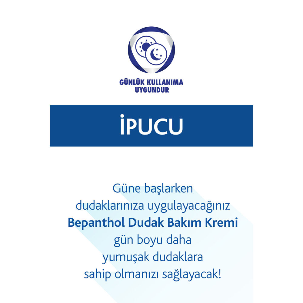 Dudaklarımız dış etkenler etkisiyle yazın ve kışın kuruyabilir. Kuruyan dudaklar çatlama sonucunda pürüzsüzlüğünü ve yumuşaklığını kaybeder. Provitamin B5 ve E vitamini içeren Bepanthol Dudak Bakım Kremi, kuruyan ve çatlayan dudaklarınızı anında nemlendirerek günlük bakımını sağlar.
