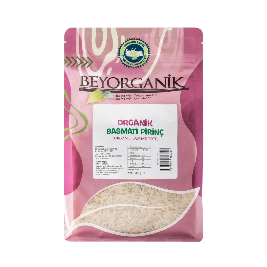 Beyorganik Organik Basmati Pirinç; organik tarım koşullarında yetiştirilmiş katkı ve koruyucu madde içermeyen basmati pirinç türüdür. Tane tane pişme performansı sayesinde pilav yapımında ya da salatalarda kaliteli bir alternatif sunar. Üretici tarafından pestisit ve aflatoksin analizlerine tabi tutulduğu belirtilmiştir.