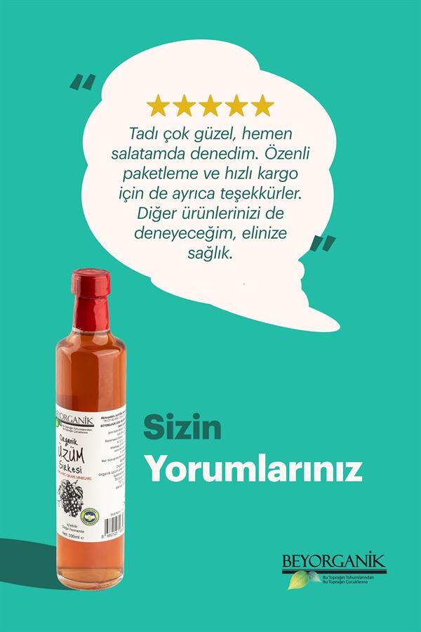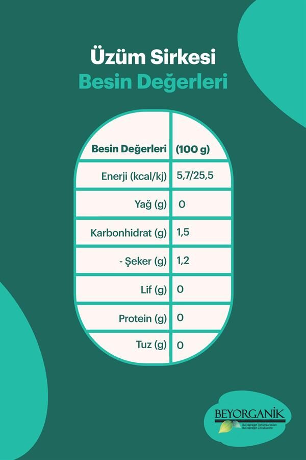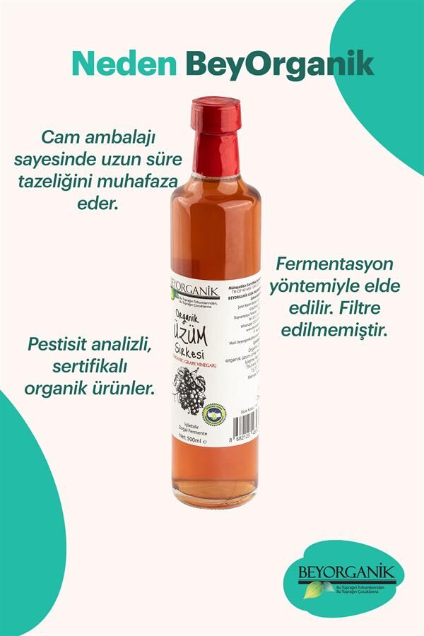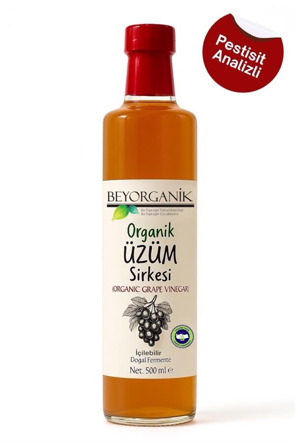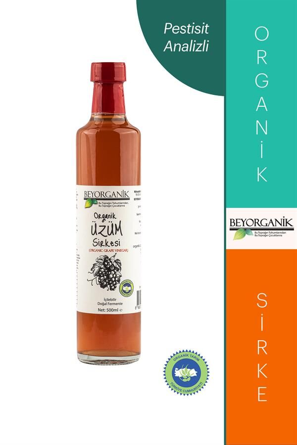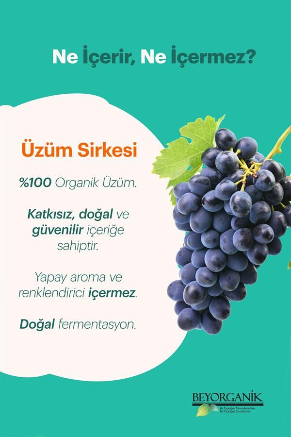 BEYORGANİK Organik Üzüm Sirkesi, %100 organik üzümlerden fermente edilerek elde edilmiştir. Filtre edilmemiştir, doğal sirke anası ve tortu içerebilir. Sağlıklı, katkısız ve koruyucusuz yapısıyla sofralarınıza katkı sunar.