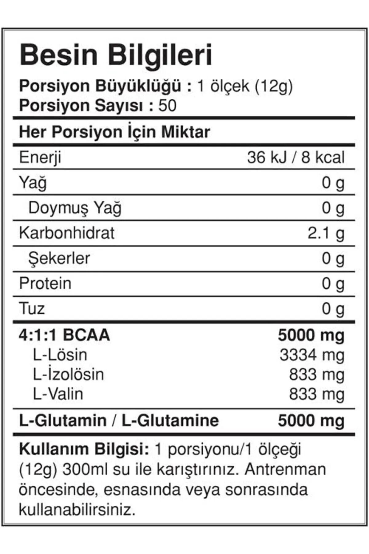 En Yararlı İki Amino Asit Bir Arada Bigjoy’un yeni serisi ile beraber en çok kullanılan takviyeleri bir arada, ayrı ayrı almaya nazaran çok daha ekonomik şekilde sunmaktadır.; BIG2 BCAA ve Glutamin, iki ayrı amino asidi eşit miktarda sunar.; 1 servisinde 5000 mg BCAA, 5000 mg glutamin sunar.; İçerisindeki BCAA 4:1:1 oranındadır.; Yani benzer ürünlere göre çok daha fazla lösin amino asidi sunar.; Lösin amino asidi, BCAA grubunda protein sentezine en fazla yararı olan amino asittir.; BIG2 BCAA ve Glutamin 50 servistir.; Toz formundadır ve vişne aromalıdır.; Kullanım Bilgisi:1 servis (12g) ürünü 300ml su veya tercih ettiğiniz başka bir içeceğe karıştırınızGünde 1 servis ürünü antrenman öncesinde, esnasında ve sonrasında kullanabilirsiniz.; Bileşenler; 1 servis (12g) için; 4:1:1 BCAA ( L-Lösin, L-Valin, L-İzolösin) 5000mg, L-Glutamin 5000mg, Karpuz Aroma Vericisi, Asitlik Düzenleyici( Malik Asit), Dekstrin, Tatlandırıcılar ( Sukraloz,Asesülfam K ), Renklendirici ( Pancar Kökü Kırmızısı), Topaklanmayı Önceleyici( Silikon Dioksit).; Alerjen Maddeler : Süt, yumurta, kereviz, soya, gluten içeren tahıllar ve hardal işleyen tesislerde üretilmiştir.; İz miktarda bulaşma olabilir.; Saklama Koşulu: Ürünün tazeliğini korumak için serin ve kuru yerde muhafaza ediniz.; Ağzı kapalı olarak saklayınız.; Doğrudan güneş ışığına maruz bırakmayınız.; ,