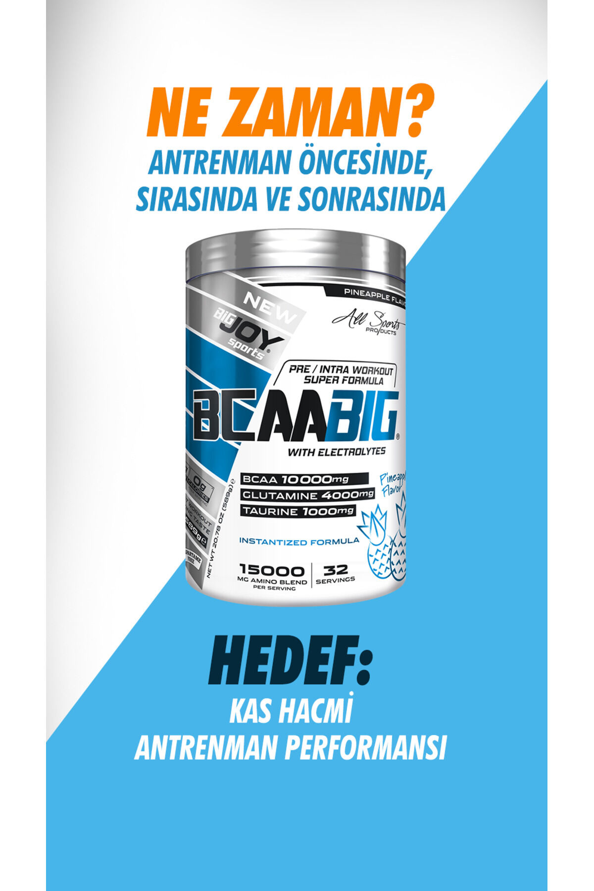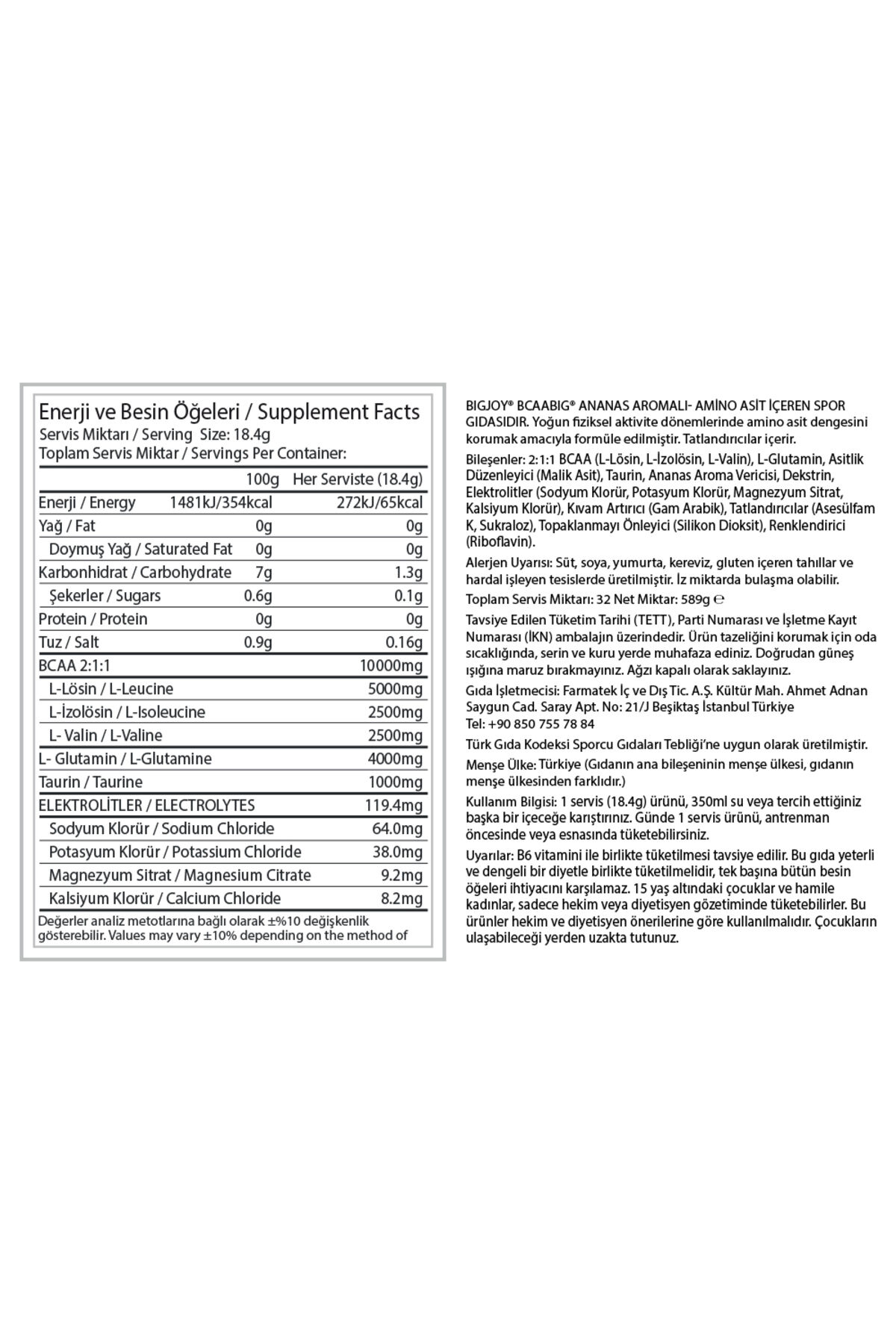 En büyük BCAA Formülü;BIGJOY® BCAABIG antrenman sırasında performansınızı artırması, antrenman sonrasında ise yenilenmeyi desteklemesi için özel olarak formüle edilmiştir.; Benzersiz bir formüle sahiptir: 1 servisinde 10 gram BCAA, 4000 mg glutamin, 1000 mg taurin ve elektrolitler içermektedir.;Toplamda 15.000 mg amino asit içeriği ile en zengin BCAA ürünüdür.; Her servisinde 10 gram BCAA içerir.;BIGJOY® BCAABIG sadece antrenman öncesinde değil antrenman sırasında ve sonrası kullanılabilecek bir üründür.; Zengin formülü ile benzersiz canlandırıcı etkiye sahip bir amino asittir.; Antrenmanda fiziksel performansınızı artırmaya destek olur.; Elektrolitler ise antrenman sırasında terleme yoluyla oluşan mineral kaybını dengeler, kaslarınızın tam kapasite ile çalışmasını sağlar.;4000 mg glutamin “recovery” yani antrenman sonrasında vücudun toparlanmasında kilit rol üstlenir.; Glutamin yıpranmış kasların tamiri ve yeni kas inşası için en çok ihtiyaç duyulan amino asittir.;Kullanım Bilgisi;;1 ölçek (18,4g) 350ml su veya tercih ettiğiniz başka bir içeceğe karıştırınız.; Antrenman öncesinde, esnasında ve sonrasında kullanabilirsiniz.; ;Bileşenler; 1 ölçek (18,4g) ; BCAA ( L-Lösin, L-İzolösin,L-Valin) 10000mg, Glutamin 4000mg, Asitlik Düzenleyici ( Sitrik Asit), Taurin 1000 mg, Ananas Aroma Vericisi , Dekstrin, Renklendirici ( Riboflavinler), Kıvam Arttırıcı (Gam Arabik), Topaklanmayı Önleyici ( Silikon Dioksit), Tatlandırıcılar ( Sukraloz, Asesülfam K), Elektrolitler 119,4mg ( Sodyum Klorür, Potasyum Klorür, Magnezyum Sitrat, Kalsiyum Klorür).; ;Alerjen Maddeler : Süt, yumurta, kereviz, soya, gluten içeren tahıllar ve hardal işleyen tesislerde üretilmiştir.; İz miktarda bulaşma olabilir.; ;Saklama Koşulu: Ürünün tazeliğini korumak için serin ve kuru yerde muhafaza ediniz.; Ağzı kapalı olarak saklayınız.; Doğrudan güneş ışığına maruz bırakmayınız.