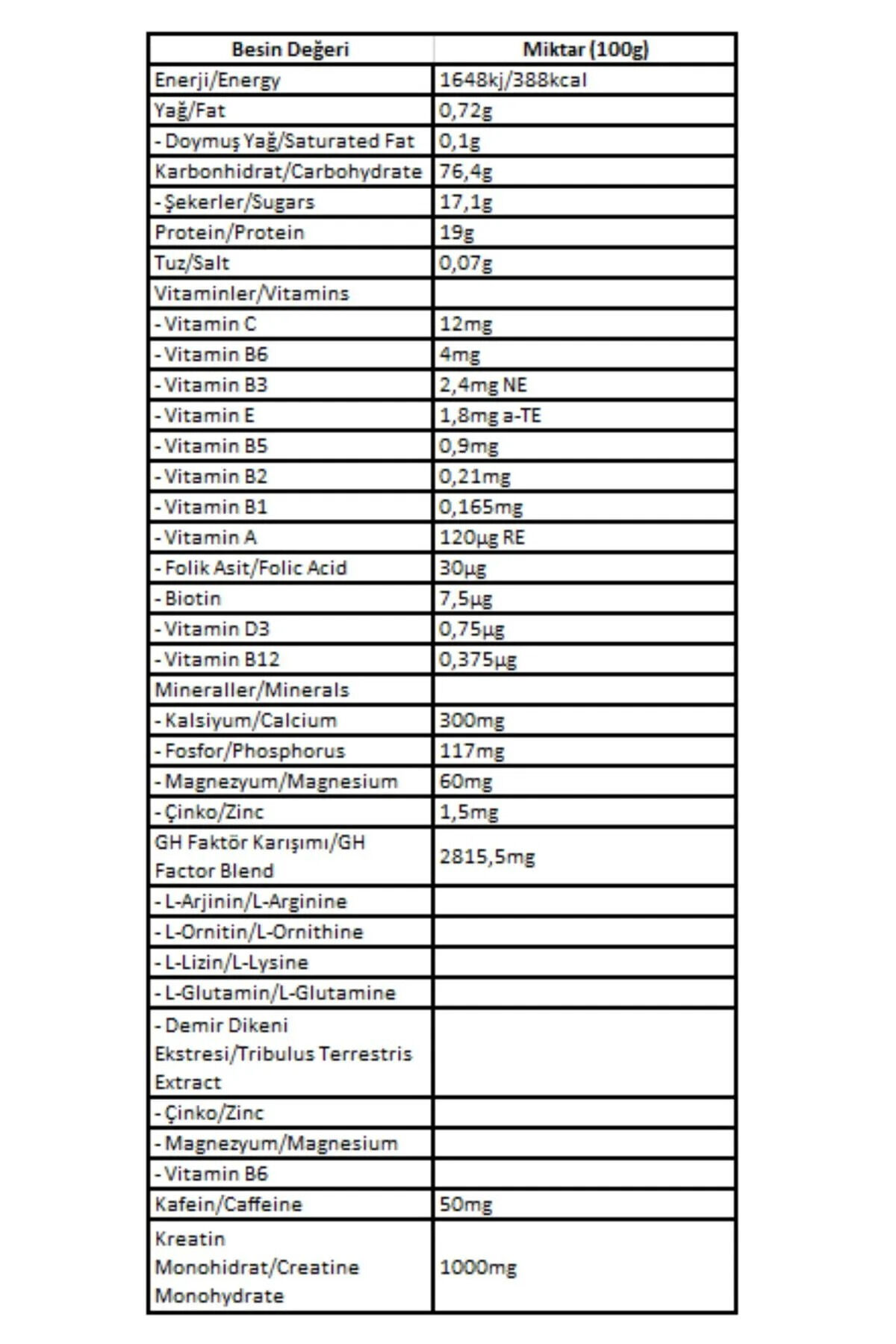 Marka:Big joy Servis sayısı:50 Servis miktarı:2 ölçek (100 g) Protein oranı: 19,6 gr Karbonhidrat oranı: 78,8 gr Yağ oranı: 0,68 gr Kullanım talimatı; Orta seviye 1 servisi (100g) 300-350ml su veya yağsız süt ile karıştırınız. Antrenmandan 1 saat önce 1 servis ve antrenmandan hemen sonra (30 dk içinde) 1 servis olmak üzere günde 2 porsiyon tüketebilirsiniz. Ileri seviye 1 servisi (100g) 300-350ml su veya yağsız süt ile karıştırınız. Antrenmandan 1 saat önce 1 servis ve antrenmandan hemen sonra (30 dk içinde) 1 servis olmak üzere günde 2 porsiyon tüketebilirsiniz. Yoğun antrenman yapan ileri seviye sporcular için, 2 ana öğün arasında 1 servis daha tüketebilir. Bir servis için besin değerleri; Enerji 396kcal ** Yağ 0,68gr ** Karbonhidrat 78,8gr ** Lif 0,3gr ** Protein 19,6gr ** Tuz 0,39gr ** Gh faktörler karışımı 2660mg ** (l-Arjinin, l-Orinitin, l-Lizin, l-Glutamin, çinko, magnezyum, tribulus, kafein, b6) ** günlük değerler saptanamamıştır. Big joy big mass +gh factors nedir? Vücut geliştirme tarihinin en başarılı sporcuları arasında gösterilen ve uluslararası bir marka haline gelen dennis james tarafından formüle edilmiş bir gainer ürünüdür. Bigjoy big mass +gh factors, hızla sindirilen maltodekstrin kaynaklı karbonhidrat ve konsantre whey proteini ile bitkisel kaynaklı protein karışımını içerir.Bigjoy big mass +gh factors, birçok weight (kilo) gainer formülünden farklı olarak gh factors olarak adlandırdığı özel bir karışıma sahiptir. Bunlar arjinin, ornitin, lizin amino asitleri, tribulus bitki ekstresiyle birlikte vitamin ve minerallerden oluşmaktadır. Big joy big mass +gh factors'ün dikkat çeken özellikleri: - %78 hızlı sindirilen karbonhidrat oranı - %19 protein oranı- Whey proteini konsantresi ve bitkisel protein karışımı - gh factors ilaveli özel formül - 50 servis Big joy big mass +gh factors 5000 gr pozitif yorumlar Hızlı sindirilen yüksek karbonhidrat içeriği, gh factors ilaveli formülü Big joy big mass +gh factors 5000 gr bunları içermez Domuz katkı maddesi, gdo, aspartam, et ürünü, koruyucu madde, renklendirici boya;