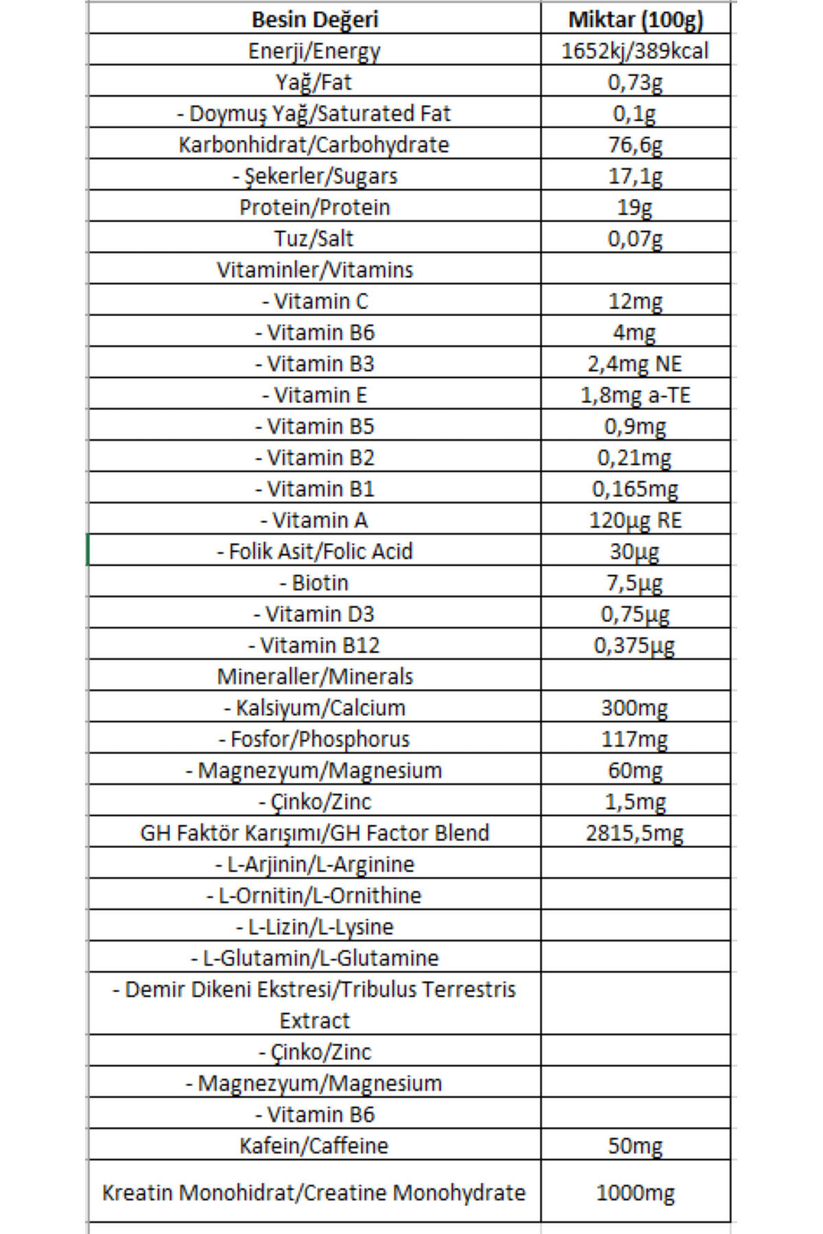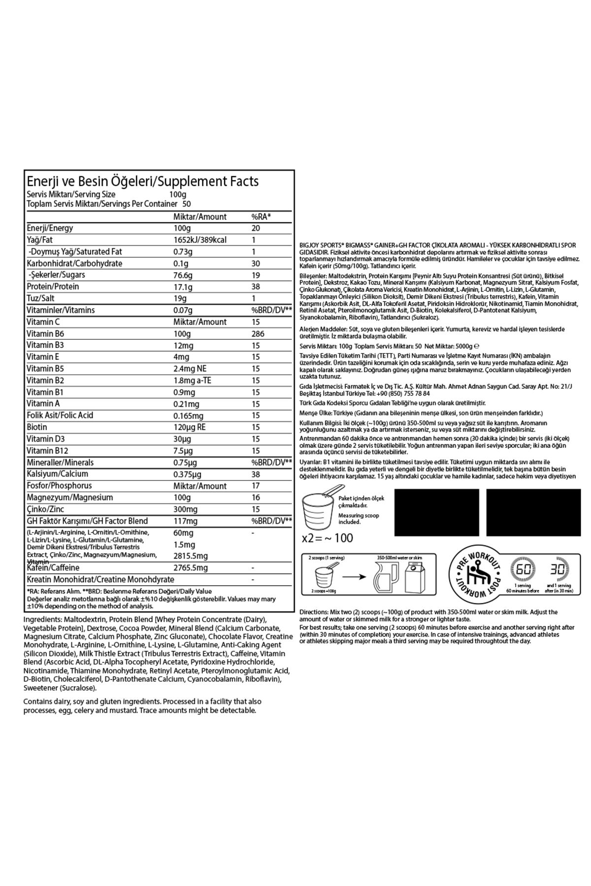 Bigjoy Sports GH Mass Karbonhidrat Tozu, antrenmanlarınızda maksimum performans ve kas gelişimi sağlamak için özel olarak formüle edilmiştir.; Bu ürünü kullanarak, spor hedeflerinize daha hızlı ulaşabilirsiniz.; İşte Bigjoy Sports GH Mass Karbonhidrat Tozu'nun içeriği ve sunduğu avantajlar: Ürün İçeriği: - *Karbonhidrat:* 100 gramında 76,6 gram karbonhidrat içerir.; Bu yüksek karbonhidrat oranı, antrenmanlar sırasında enerjinizi artırarak performansınızı maksimize eder.; - *Protein:* 19 gram protein içerir.; Protein, kasların onarımı ve büyümesi için gereklidir, bu nedenle yoğun antrenman programları için ideal bir destektir.; - *Kreatin:* 1 gram kreatin içerir.; Kreatin, kas kütlesi ve gücünü artırmak için önemli bir bileşendir.; - *GH Faktör Karışımı:* 2815,5 mg GH faktör karışımı içerir.; Bu özel karışım, büyüme hormonu seviyelerini destekler ve kas gelişimini hızlandırır.; Öne Çıkan Özellikleri: - * Yüksek Karbonhidrat Oranı* - *Kas gelişimi* - *Yüksek protein içeriği* - *Kreatin takviyesi* - *Büyüme hormonu desteği* - *Enerji artırıcı* - *Antrenman performansı* Detaylı İçerik: Bigjoy Sports GH Mass Karbonhidrat Tozu, sporcuların enerji seviyelerini artırarak antrenman performansını üst seviyeye çıkarır.; Yüksek karbonhidrat içeriği sayesinde vücudunuzun ihtiyaç duyduğu enerjiyi sağlar ve antrenman sonrası toparlanma sürecini hızlandırır.; Bu ürün, kas kütlesi kazanmak isteyen sporcular için mükemmel bir tercihtir.; İçerdiği 19 gram protein, kasların onarımı ve büyümesi için gerekli olan amino asitleri sağlar.; Ayrıca, Bigjoy Sports GH Mass, kreatin desteği sunarak kas gücünü ve dayanıklılığını artırır.; Kreatin, özellikle yoğun ve yüksek tempolu antrenmanlar yapan sporcular için vazgeçilmez bir bileşendir.; 1 gram kreatin içeriği, kas hücrelerine hızlı enerji sağlayarak performansınızı artırır ve daha yoğun antrenmanlar yapmanızı mümkün kılar.; GH faktör karışımı ise büyüme hormonu seviyelerini destekler.; 2815,5 mg GH faktör karışımı, kas gelişimini hızlandırarak daha kısa sürede daha belirgin sonuçlar elde etmenizi sağlar.; Bu özel formül, antrenman programınızı destekleyerek kas kütlesi kazanımınızı en üst düzeye çıkarır.; Bigjoy Sports GH Mass Karbonhidrat Tozu, kas kütlesi ve güç kazanımı hedefleyen sporcular için mükemmel bir üründür.; Yüksek karbonhidrat ve protein içeriği, kreatin desteği ve özel GH faktör karışımı ile antrenman performansınızı artırır ve kas gelişiminizi destekler.; Siz de spor hedeflerinize ulaşmak ve performansınızı maksimize etmek istiyorsanız, Bigjoy Sports GH Mass Karbonhidrat Tozu'nu deneyin.; Bigjoy Sports GH Mass Karbonhidrat Tozu, sporcu besinleri kategorisinde öne çıkan bir ürün olarak dikkat çekmektedir.; Kas gelişimi, enerji artırıcı özellikleri ve kreatin desteği sayesinde sporcuların vazgeçilmezi olmaya adaydır.; Etken maddeler: Karbonhidrat , ; Kompleks protein , ; Bcaa , ; Vitamin B6 - ; Kreatin Monohidrat ; Amino Asit ; GH Faktör Karışımı/GH Factor Blend ; Hedef : Hacim Kazanmak Kilo Kullanım Amacı Kilo Cinsiyet : Erkek, Kadın İçerik Tipi: Toz ;