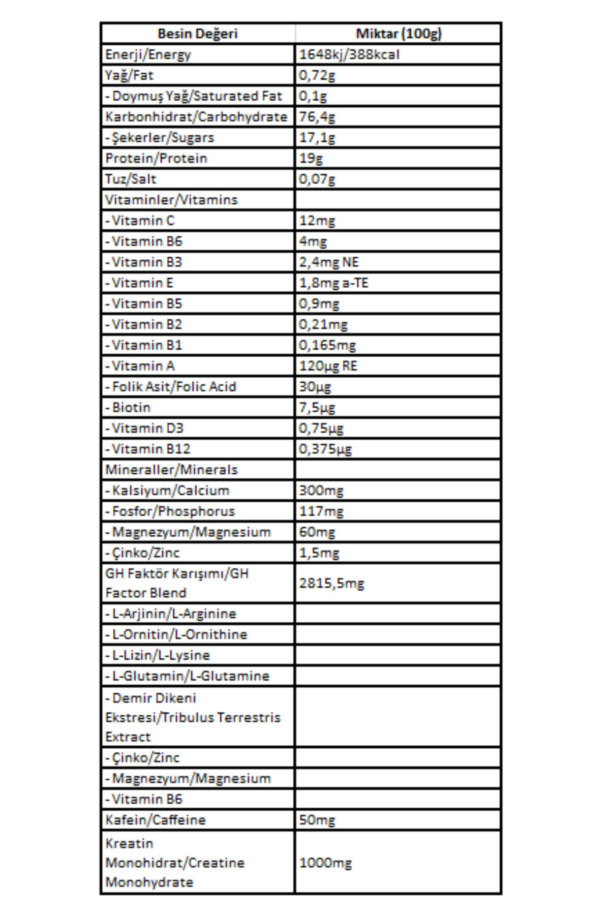 Bigjoy Sports GH Mass Karbonhidrat Tozu, antrenmanlarınızda maksimum performans ve kas gelişimi sağlamak için özel olarak formüle edilmiştir.; ; Bu ürünü kullanarak, spor hedeflerinize daha hızlı ulaşabilirsiniz.; ; İşte Bigjoy Sports GH Mass Karbonhidrat Tozu'nun içeriği ve sunduğu avantajlar: ; Ürün İçeriği: ; Karbonhidrat: 100 gramında 76,6 gram karbonhidrat içerir.; ; Bu yüksek karbonhidrat oranı, antrenmanlar sırasında enerjinizi artırarak performansınızı maksimize eder.; ; Protein:19 gram protein içerir.; ; Protein, kasların onarımı ve büyümesi için gereklidir, bu nedenle yoğun antrenman programları için ideal bir destektir.; ; Kreatin: 1 gram kreatin içerir.; ; Kreatin, kas kütlesi ve gücünü artırmak için önemli bir bileşendir.; ; GH Faktör Karışımı: 2815,5 mg GH faktör karışımı içerir.; ; Bu özel karışım, büyüme hormonu seviyelerini destekler ve kas gelişimini hızlandırır.; ; Öne Çıkan Özellikleri: ; Yüksek Karbonhidrat Oranı ; Kas gelişimi ; Yüksek protein içeriği ; Kreatin takviyesi ; Büyüme hormonu desteği ; Enerji artırıcı ; Antrenman performansı ; Detaylı İçerik: Bigjoy Sports GH Mass Karbonhidrat Tozu, sporcuların enerji seviyelerini artırarak antrenman performansını üst seviyeye çıkarır.; ; Yüksek karbonhidrat içeriği sayesinde vücudunuzun ihtiyaç duyduğu enerjiyi sağlar ve antrenman sonrası toparlanma sürecini hızlandırır.; ; Bu ürün, kas kütlesi kazanmak isteyen sporcular için mükemmel bir tercihtir.; ; İçerdiği 19 gram protein, kasların onarımı ve büyümesi için gerekli olan amino asitleri sağlar.; ; Ayrıca, Bigjoy Sports GH Mass, kreatin desteği sunarak kas gücünü ve dayanıklılığını artırır.; ; Kreatin, özellikle yoğun ve yüksek tempolu antrenmanlar yapan sporcular için vazgeçilmez bir bileşendir.; ; 1 gram kreatin içeriği, kas hücrelerine hızlı enerji sağlayarak performansınızı artırır ve daha yoğun antrenmanlar yapmanızı mümkün kılar.; ; GH faktör karışımı ise büyüme hormonu seviyelerini destekler.; ; 2815,5 mg GH faktör karışımı, kas gelişimini hızlandırarak daha kısa sürede daha belirgin sonuçlar elde etmenizi sağlar.; ; Bu özel formül, antrenman programınızı destekleyerek kas kütlesi kazanımınızı en üst düzeye çıkarır.; ; Bigjoy Sports GH Mass Karbonhidrat Tozu, kas kütlesi ve güç kazanımı hedefleyen sporcular için mükemmel bir üründür.; ; Yüksek karbonhidrat ve protein içeriği, kreatin desteği ve özel GH faktör karışımı ile antrenman performansınızı artırır ve kas gelişiminizi destekler.; ; Siz de spor hedeflerinize ulaşmak ve performansınızı maksimize etmek istiyorsanız, Bigjoy Sports GH Mass Karbonhidrat Tozu'nu deneyin.; ; Bigjoy Sports GH Mass Karbonhidrat Tozu, sporcu besinleri kategorisinde öne çıkan bir ürün olarak dikkat çekmektedir.; ; Kas gelişimi, enerji artırıcı özellikleri ve kreatin desteği sayesinde sporcuların vazgeçilmezi olmaya adaydır.; ;