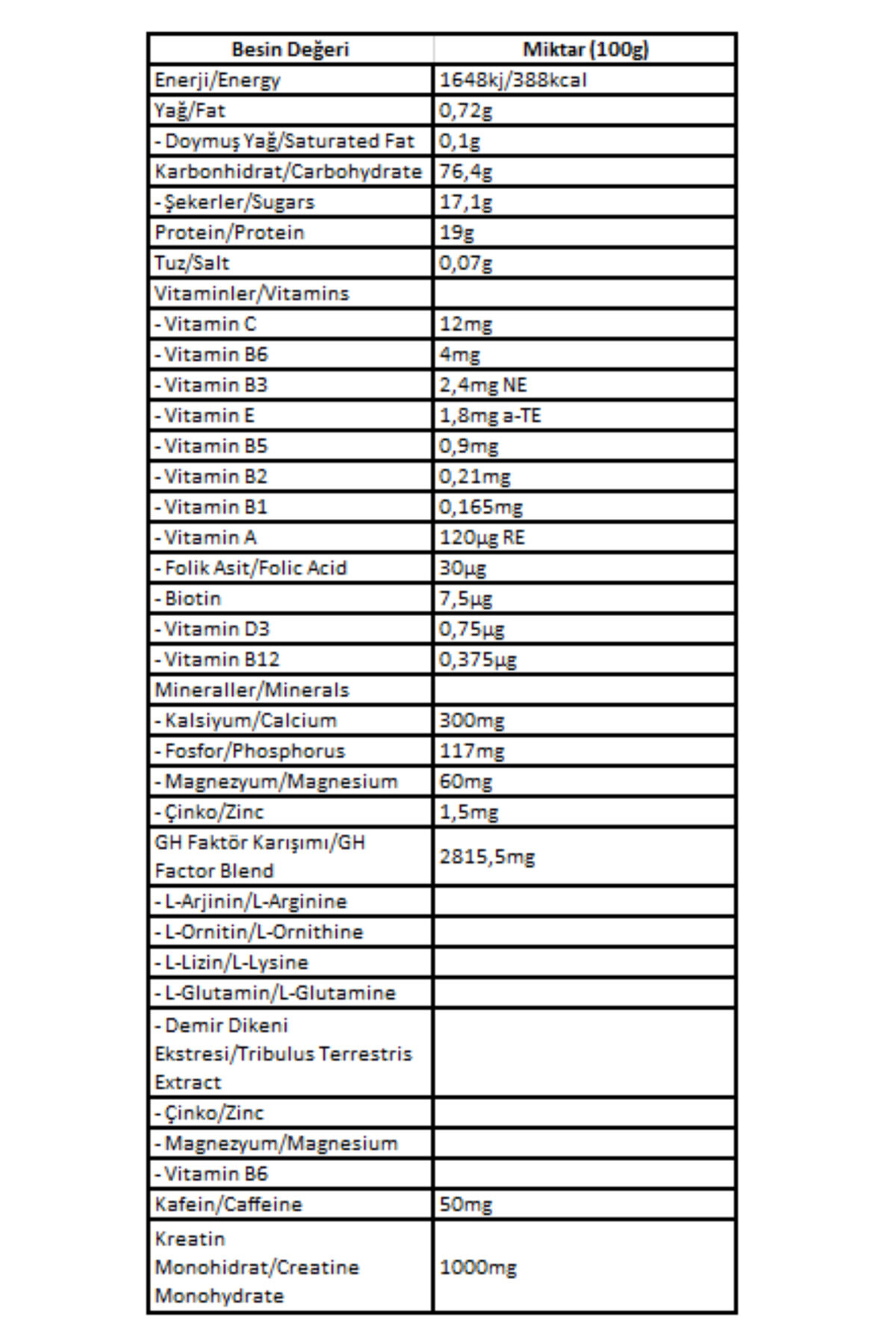 Bigjoy BIGMASS GH FACTORS – Gelişmiş İçeriğe Sahip Hacim Kazandırıcı Destek;Bigmass GH FACTORS, hacim kazanmak isteyen sporcular için özel olarak formüle edilmiş, protein ve karbonhidratın ötesine geçen gelişmiş içerikli bir gainer ürünüdür. Sadece kalori desteği sunmakla kalmaz, aynı zamanda içeriğindeki arginin, ornitin, lizin, glutamin, çinko, magnezyum, tribulus, kafein ve B6 vitamini ile antrenman verimliliğini ve toparlanmayı destekler.;Her serviste:;76.4 g karbonhidrat (maltodekstrin ve dekstroz kaynaklı);19 g protein;Şeker (sakkaroz) içermez;Servis boyutunun 100 gram olarak belirlenmesi, daha yüksek biyoyararlanım sağlar ve sindirim sisteminin besinleri daha etkin işlemesine yardımcı olur.;Destekleyici Bileşenlerle Güçlendirilmiş Formül:;Arginin, ornitin ve lizin: Kas yapımını ve doğal büyüme hormonu desteğini destekleyen amino asitler;Glutamin: Antrenman sonrası toparlanmaya katkı sağlar;Çinko ve magnezyum: Normal protein sentezine ve bağışıklık sisteminin korunmasına katkıda bulunur;Tribulus ve kafein: Performans destekleyici bileşenler;Kimler İçin Uygun?;Kilo ve hacim kazanmak isteyen sporcular;Günlük kalori ihtiyacını karşılamakta zorlanan bireyler;Antrenman sonrası toparlanma ve enerji desteğine ihtiyaç duyanlar;Bigmass GH FACTORS, kas gelişimi ve enerji desteğini aynı potada sunan, modern sporcu beslenmesinin ihtiyaçlarına göre geliştirilmiş bir üründür.