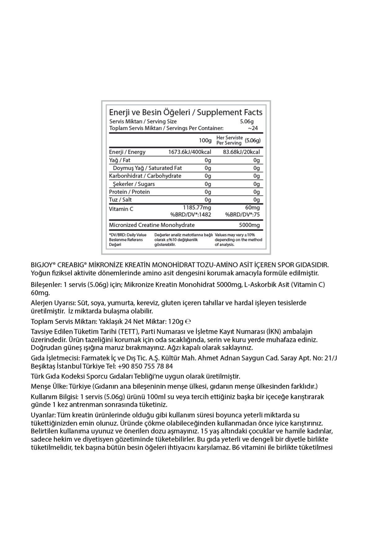 Kreatin sporcuların en fazla kullandığı ve hakkında en fazla araştırma yapılmış ürünlerden bir tanesidir.; Protein tozundan sonra dünyanın en popüler ikinci ürünüdür.; Temel görevi, vücudun enerji kaynağı olan olarak kullandığı ATP’lerin üretimine destek olmaktır.; BIGJOY® CreaBIG aromasızdır.; Antrenman sonrasında kullandığınız her ürünün içerisine ekleyerek kendi karışımınızı yaratabilirsiniz.; Örneğin elinizde bir protein tozu varsa, aromasız kreatin ekleyerek kullanabilirsiniz.; Kullanım bilgisi 1 servis (5,06g) ürünü 100 ml su ile karıştırarak günde bir kez antrenman sonrasında tüketiniz.; Bileşenler; 1 servis (5,04g) için; Mikronize Kreatin Monohidrat 5000mg, L-Askorbik Asit (Vitamin C) 40mg.; Alerjen Maddeler : Süt, yumurta, kereviz, soya, gluten içeren tahıllar ve hardal işleyen tesislerde üretilmiştir.; İz miktarda bulaşma olabilir.; Saklama Koşulu: Ürünün tazeliğini korumak için serin ve kuru yerde muhafaza ediniz.; Ağzı kapalı olarak saklayınız.; Doğrudan güneş ışığına maruz bırakmayınız.