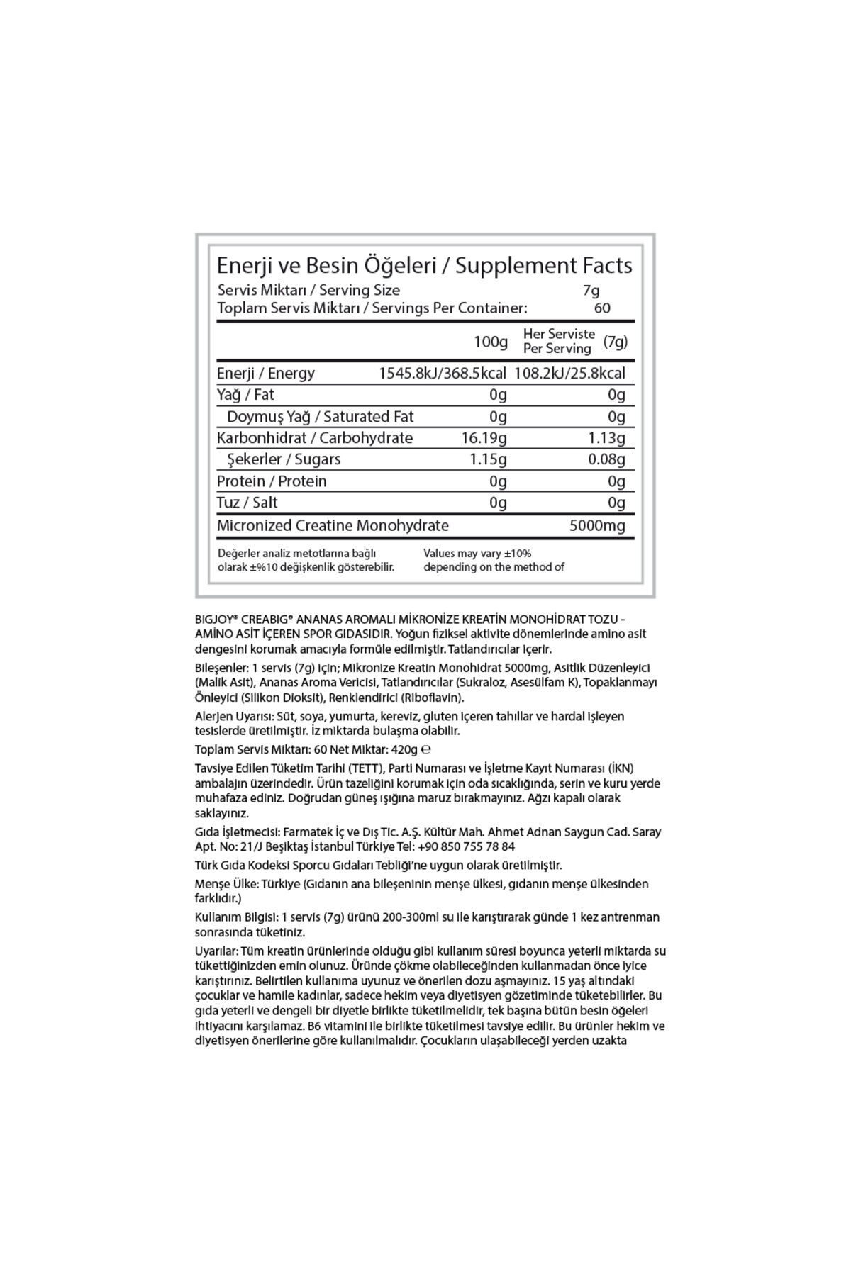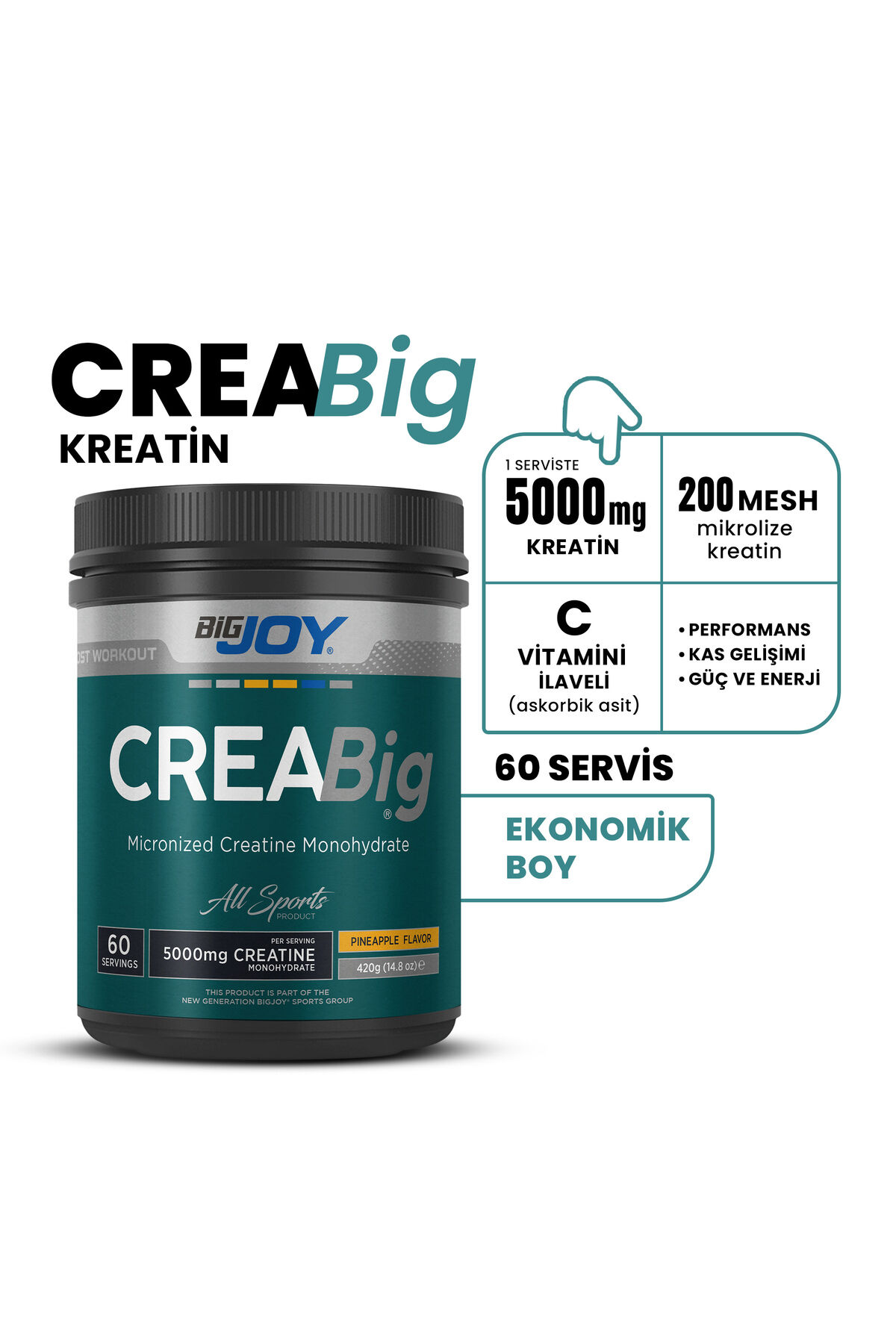 Kreatin sporcuların en fazla kullandığı ve hakkında en fazla araştırma yapılmış ürünlerden bir tanesidir.; Protein tozundan sonra dünyanın en popüler ikinci ürünüdür.; Temel görevi, vücudun enerji kaynağı olan olarak kullandığı ATP’lerin üretimine destek olmaktır.; BIGJOY® CreaBIG aromasızdır.; Antrenman sonrasında kullandığınız her ürünün içerisine ekleyerek kendi karışımınızı yaratabilirsiniz.; Örneğin elinizde bir protein tozu varsa, aromasız kreatin ekleyerek kullanabilirsiniz.; Kullanım bilgisi 1 servis (7,06g) ürünü, 200-300 ml su ile karıştırarak günde 1 kez antrenman sonrasında tüketiniz.; Bileşenler; 1 servis (7,06g) için; Mikronize Kreatin Monohidrat 5000mg, L-Askorbik Asit (Vitamin C) 60mg, Asitlik Düzenleyici ( Malik Asit), Ananas Aroma Vericisi, Tatlandırıcılar ( Sukraloz, Asesülfam K), Topaklanmayı Önleyici ( Silikon Dioksit), Renklendirici ( Riboflavin) Alerjen Maddeler : Süt, yumurta, kereviz, soya, gluten içeren tahıllar ve hardal işleyen tesislerde üretilmiştir.; İz miktarda bulaşma olabilir.; Saklama Koşulu: Ürünün tazeliğini korumak için serin ve kuru yerde muhafaza ediniz.; Ağzı kapalı olarak saklayınız.; Doğrudan güneş ışığına maruz bırakmayınız.