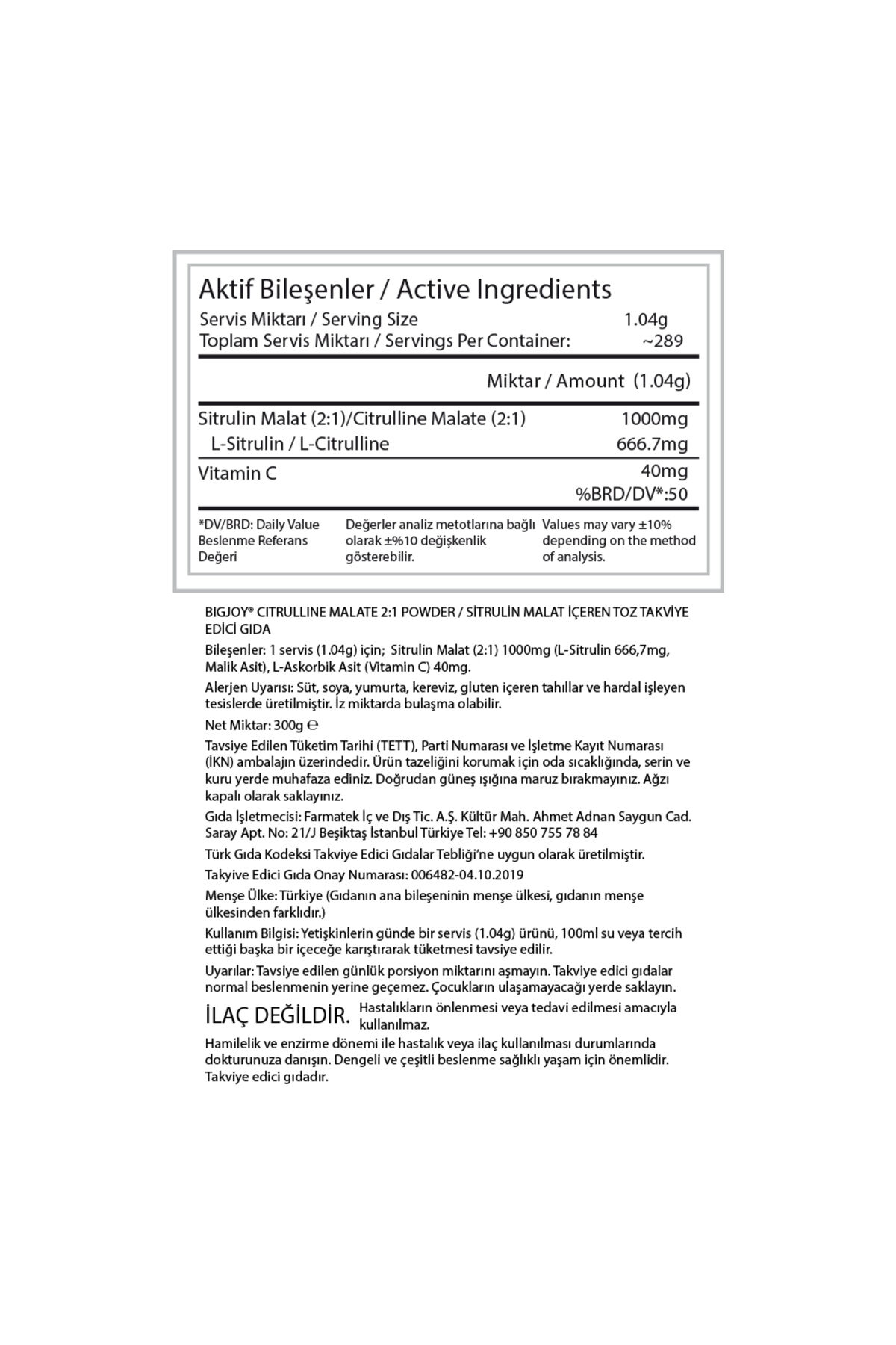 Sitrülin Malat Nedir? Sitrülin malat, ilk kullanımda bile gözle görülür değişik sağlayan supplement’lerden biri olduğu için dünyada son dönemde popülaritesi iyice artan üründür.; İsminden de anlaşılacağı üzere sitrülin’in malik asit ile bağlanmış halidir.; Bigjoy Citrulline Malate, %100 saf formda sitrülin malat sunar.; Dilerseniz tek başına, dilerseniz başka bir takviyenin içerisine ekleyerek kullanabilirsiniz.; Faydaları nelerdir? Pek çok kişi sitrülin malat amino asidini yorgunluk savaşçısı olarak nitelendirir.; Bunun sebebi antrenman esnasında oluşan amonyak gibi toksik maddelerin vücuttan atılmasına destek olarak, kaslardaki yanma hissini ve yorgunluğu azaltmasıdır.; Aynı zamanda yağ ve glikojen depolarını kullanarak vücudunuzun ATP (enerji) üretimi hızlandırır ve böylece performansınızın yükselmesine, setler arasında toparlanma hızınızın artmasına yardımcı olur.; Sitrülin vücut içinde arjinine dönüşür ve nitrik oksit miktarını yükseltir.; Böylece kan damarları genişler, kan akışı artar.; Artan kan akışı ile beraber kaslara daha fazla besin, oksijen ve glikoz gider, yıpranan kasların onarımı ve yeni kas gelişimi hızlanır.; Daha yüksek pump hissi oluşur.; Nasıl Kullanılır : Yetişkinlerin günde 1 servis (1,04g) ürünü, 100ml su veya tercih ettiği başka bir içeceğe karıştırarak tüketmesi tavsiye edilir.; Bileşenler : 1 Servis (1,04g) için ; Sitrulin Malat (2:1) 1000mg (L-Sitrulin 666,7 mg Malik Asit), L-Askorbik Asit ( Vitamin C) 40mg Alerjen Uyarısı : Süt, soya, yumurta, kereviz, gluten içeren tahıllar ve hardal işleyen tesislerde üretilmiştir.; İz miktarda bulaşma olabilir.; Saklama Koşulu: Ürünün tazeliğini korumak için serin ve kuru yerde muhafaza ediniz.; Ağzı kapalı olarak saklayınız.; Doğrudan güneş ışığına maruz bırakmayınız.