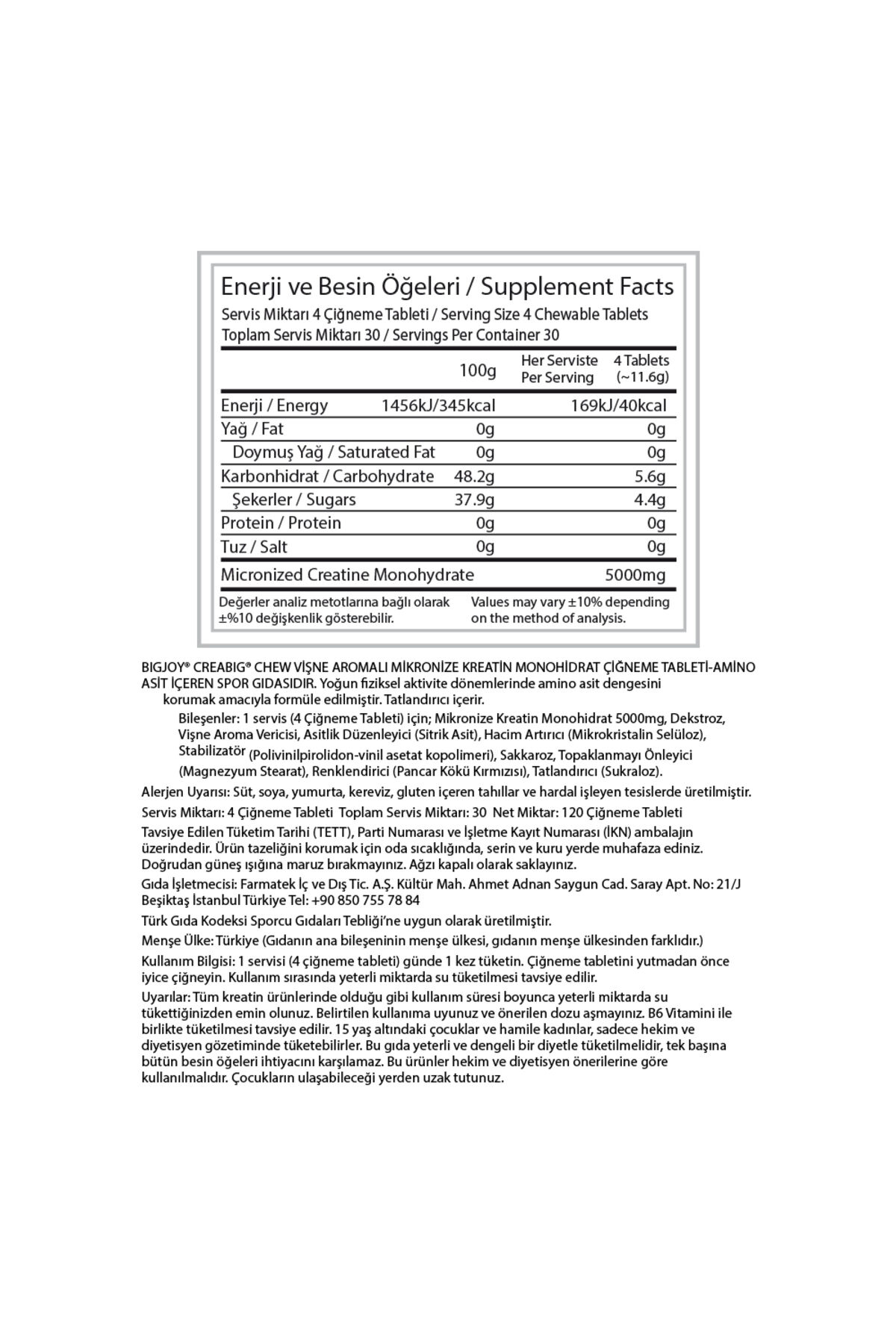 Bigjoy Sports Kreatin Creabig Chew Vişne Aromalı Çiğnenebilir Tablet 120 Adet 30 Servis