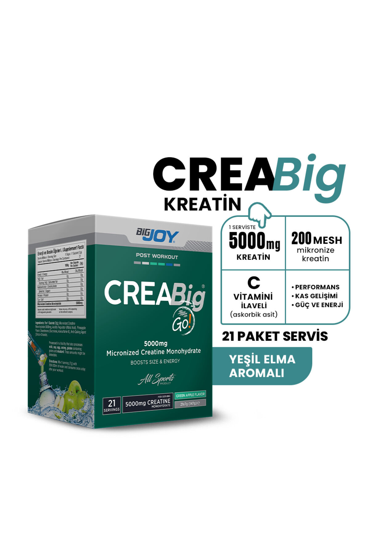 Amino asitler şimdi tekli pakette! ; ; Bigjoy farkı ile şimdi BCAA, kreatin, arjinin ve glutamin dünyada ilk defa tekli pakette.; Yani artık besin desteğini shaker içinde taşımak zorunda değilsiniz.; Tekli paketleri çantanızda, cebinizde ya da iş yerinde çekmecenizde kolaylıkla saklayabilir, antrenman öncesinde ve sonrasında pratik bir şekilde kullanabilirsiniz.; ; ; ; Kreatinin faydaları nedir? ; ; Kreatin temel görevi, kısa süreli ve yoğun fiziksek aktivitelerde kaslara enerji takviye etmek olan bir takviyedir.; Kısa süreli yoğun egzersizlerde vücut kreatini temel enerji kaynağı olan ATP’ye dönüştürür.; ; ; ; Eşsiz kılan nedir? ; ; BIGJOY Creabig GO tekli paketlerde ve toz formdadır ve aroma içermez.; 1 kutuda 21 paket vardır.; Her pakette 5 gram kreatin içerir.; ; ;BIGJOY Creabig GO, elma aromasıyla benzersiz bir tada sahiptir.; ; ; ; Ne zaman kullanılır? ; ; BIGJOY Creabig Go’yu antrenman sonrasında 1 paket kullanabilirsiniz.