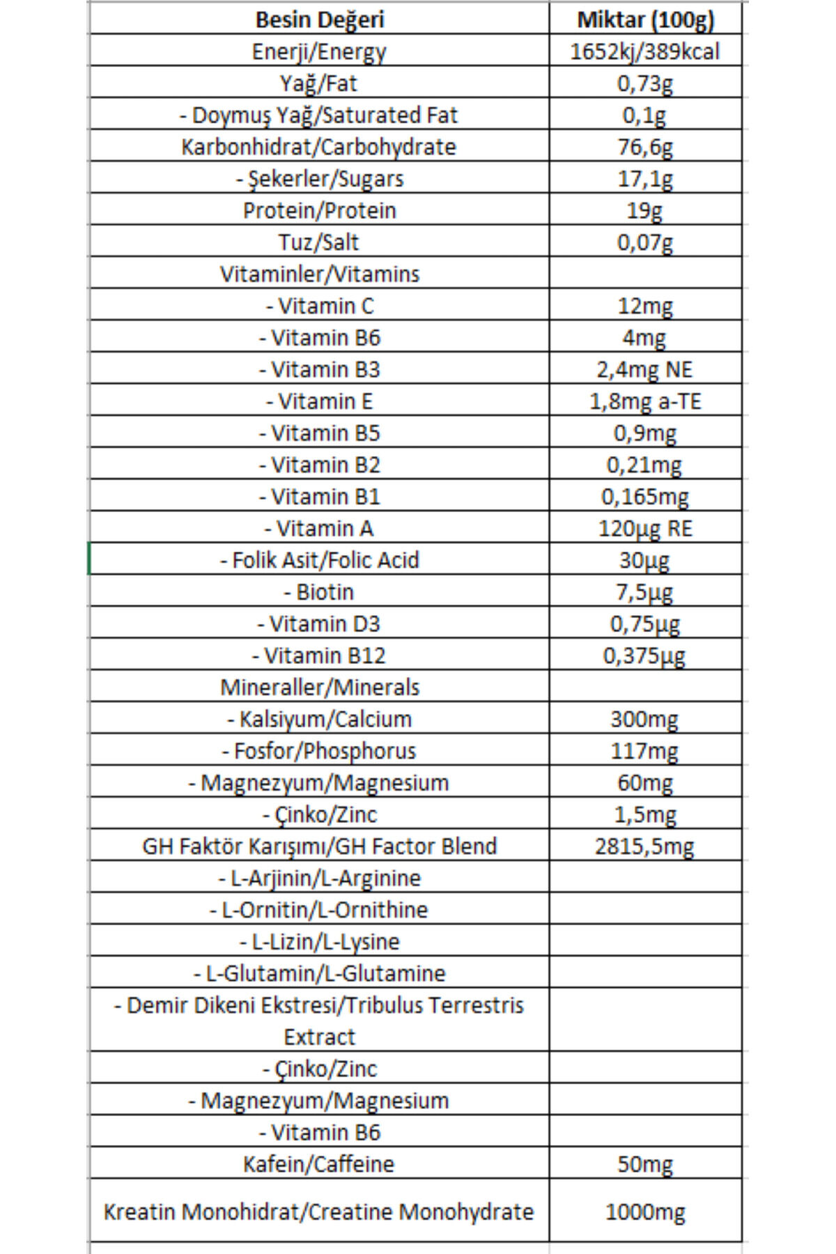 Bigjoy BigMass Gainer + GH Factors Nedir? Faydaları Nelerdir? BIGJOY® BigMass Gainer, + GH Factors markanın gainer kategorisinde en yenilikçi ürünü olarak sunuluyor;Bigmass Gainer + GH Factors dünyaca ünlü vücut geliştirici ve antrenör olan Dennis James tarafından Bigjoy markasına özel formüle edilmiş benzersiz içerikte bir gainer ürünüdür;Karbonhidrat tozu/gainer kategorisinde yer alan ürün karbonhidrat ve protein içeriği ile vücut ağırlığını artırmak ve hacim kazanmak isteyen kişilerin kilo almasına yardımcı olur;Ayrıca yüksek performans gerektiren sporlarda, daha şiddetli antrenman yapmanıza destek olur;BIGJOY® BigMass Gainer, zengin bir formüle sahiptir;Her porsiyonunda 79 gram yüksek kalitede karbonhidrat ve 20 gram protein sunar;Formülündeki ilave etkenlerle antrenmanda performansınızı yükseltmeye yardımcı olur;İlave İçerik, Güçlendirilmiş Formül: 1 servisinde 1000mg kreatine ek olarak, 2660mg GH Faktörleri karışımı içerir;L;Arjinin, L;Ornitin, L;Lizin, L;Glutamin, ZMA (Çinko, magnezyum, vitamin B6), Tribulus ve Kafein içerir;Öne Çıkan Özellikler:;Hacim için ideal;Zengin içerik;İlave Tribulus;İlave ZMA;İlave AOL;İlave Kafein Nasıl kullanılır? Başlangıç seviyesindekiler antrenmanın 1 saat öncesinde ve/veya antrenman sonrasında 1 servis (2 ölçek) kullanabilir;2 ölçek ürün 100gr'dır;İlerleyen seviyelerde antrenman öncesi, sonrası ve ana öğünlerin arasında olmak üzere günde 3 servis kullanılabilir