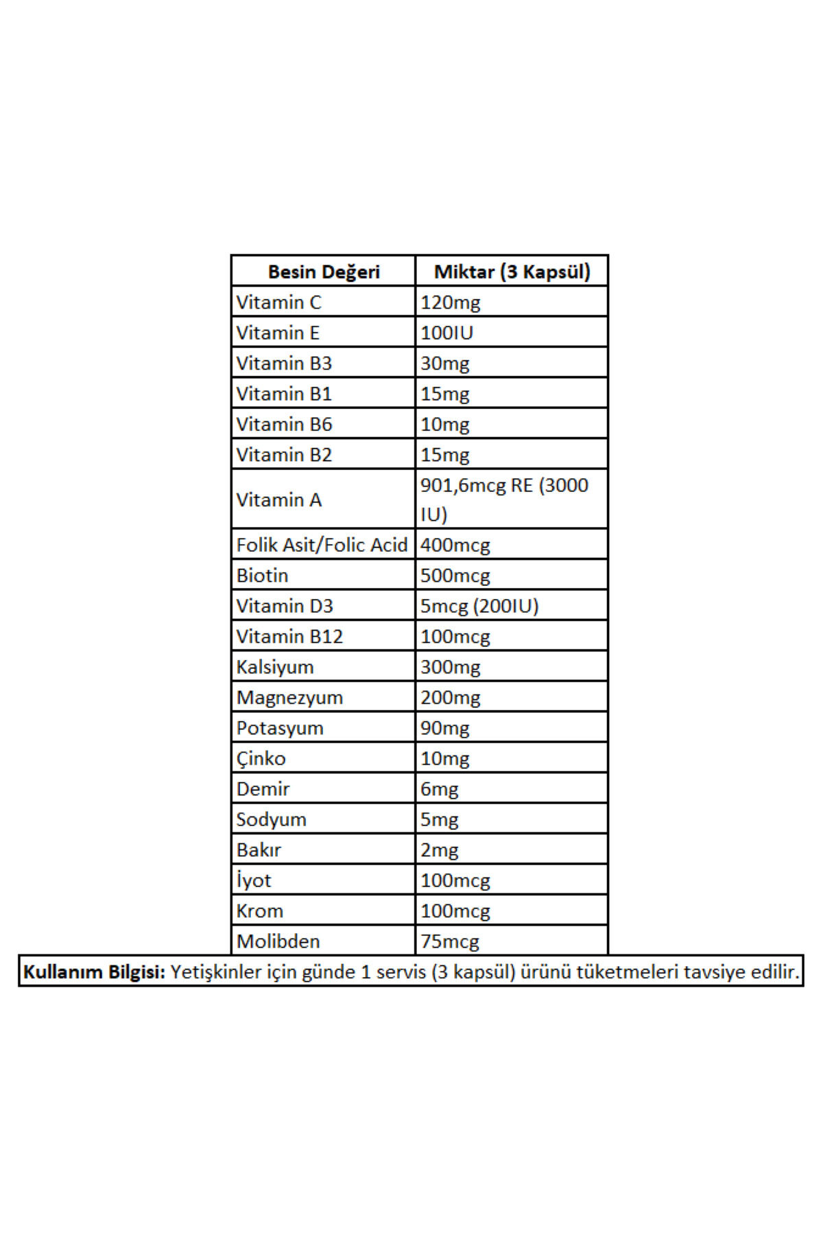 Big Joy Sports Multibig Vitamin Mineral 90 Kapsül nasıl kullanılır? Başlangıç SeviyesiGünde 3 kapsül bol su ile birlikte tüketiniz; Orta SeviyeGünde 3 kapsül bol su ile birlikte tüketiniz; İleri SeviyeGünde 3 kapsül bol su ile birlikte tüketiniz; Big Joy Sports Multibig Vitamin Mineral 90 Kapsül Detaylı Açıklama Big Joy Sports Multibig Vitamin Mineral nedir? Bitkisel ürünlerle güçlendirilmiş zengin içerikli bir vitamin mineral destek ürünüdür; Aktif yaşam ve sporcular için formülize edilmiştir; İçerisinde bulunan bitkisel maddelerin anti oksidant etkisi vardır; Big Joy Sports Multibig Vitamin Mineral'in öne çıkan özellikleri:; Güçlü içerik ve yüksek değerli vitamin mineraller; Anti oksidans etki; Bitkisel içerikli ekstreler Big Joy Sports Multibig Vitamin Mineral 90 Kapsül İçeriği % Günlük Değer; 90 Kapsül Servis Miktarı : 3 Kapsül Servis Sayısı : 30 Vitamin C 120mg; Vitamin E 46mg; Vitamin B3 30mg; Vitamin B1 15mg; Vitamin B2 15mg; Vitamin B6 10mg; Vitamin A 901; 6mcg; Biotin 500mcg; Folik Asit 400mcg; Vitamin B12 100mcg; Vitamin D 5mcg; Kalsiyum 300mg; Magnezyum 200mg; Potasyum 90mg; Çinko 10mg; Demir 6mg; Sodyum 5mg; Bakır 2mg; Manganez 2mg; İyot 100mcg; Krom 100mcg; Molibden 75mcg; Selenyum 50mcg; Yeşil Çay Ekstresi 100mcg; Beta Alanin 100mcg; Kafein 70mg; Gingseng Ekstresi 68mg; Guarana Ekstresi 50mg; L; Karnitin 50mg; Alfa Lipoik Asit 25mg; İnositol 20mg; Kolin 15mg; Ginkgo Ekstresi 5mg; Günlük değerler saptanamamıştır;