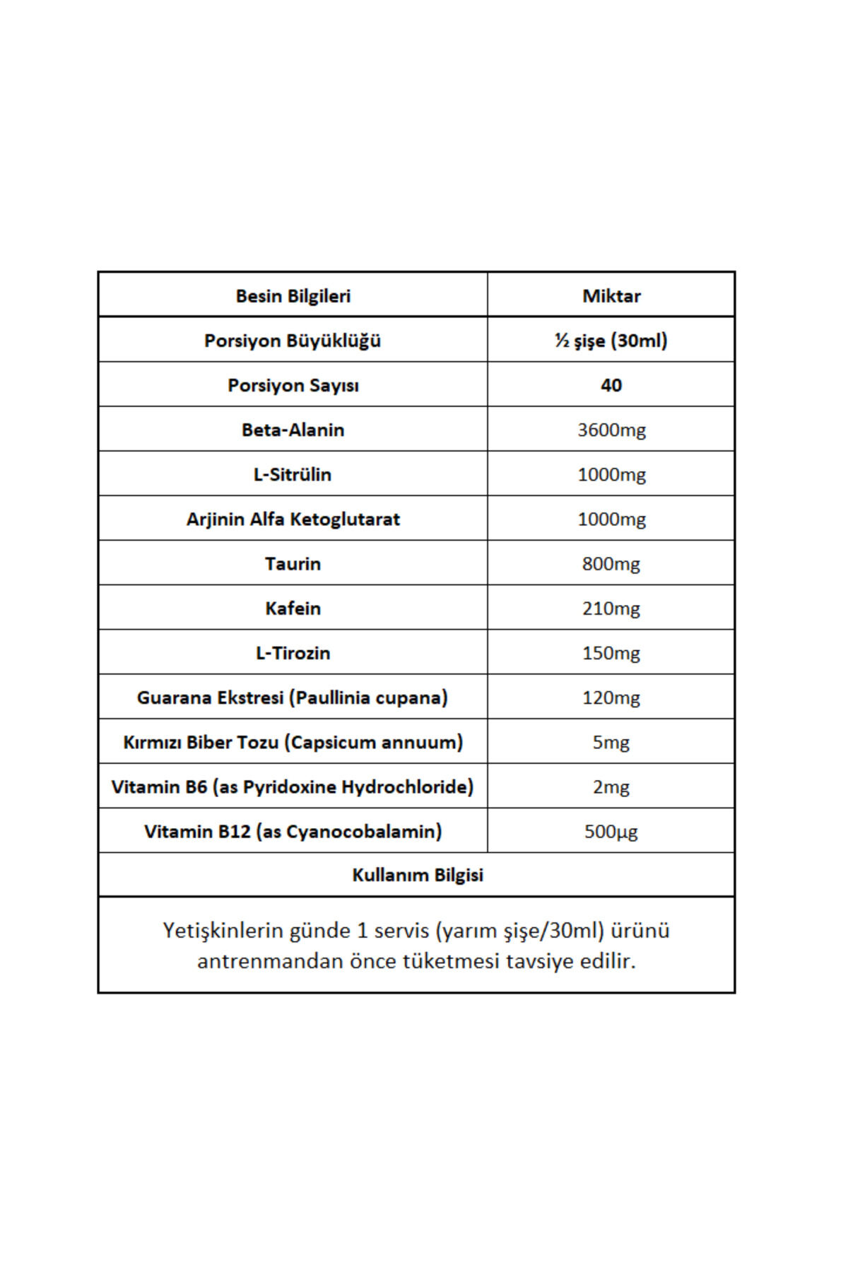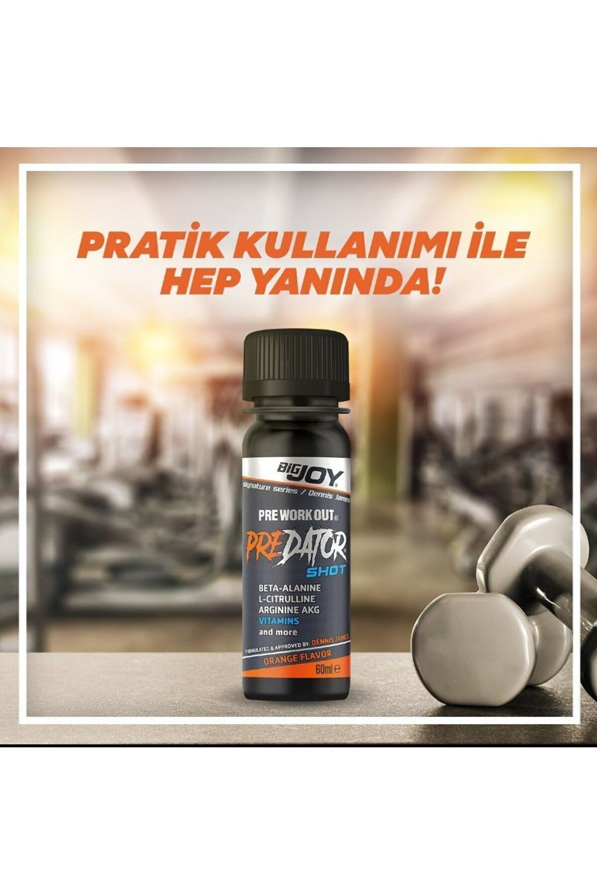 BİG JOY PREDATOR 1200 ML(60 ML); 20 SHOT Preadator: 1 SHOT(30 mL)'de 1000 mg arjinin AKG içerir; Arjinin, nitrik oksit seviyelerinin yukarı taşınmasını sağlar,; Artan kan akışı ile beraber kaslara daha fazla besin, oksijen ve glikoz gider, yıpranan kasların onarımı ve yeni kas gelişimi hızlanır; Daha yüksek pump hissi oluşur; Preadator: 1 SHOT(30 mL)'de 3600 mg beta alanin içerir; Beta alanin, pek çok preworkout ürününde kullanılan, antrenman performansınızı artırmaya yardım eden bir amino asittir; En büyük faydası yorgunluk seviyesini aşağıya çekmeyi desteklemesi ve kas dayanıklılığını artırmaya yardımcı olmasıdır; Bu özellikleri sayesinde daha uzun süre ve daha şiddetli antrenman yapmanıza katkıda bulunur; Preadator: 1 SHOT(30 mL)'de 1000 mg sitrülin içerir; Sitrülin sporcuların antrenman performansını artırmak için en çok kullandığı amino asitlerden bir tanesidir; Yüksek yoğunluklu ağırlık antrenmanında setler arasında daha hızlı toparlanma sağlar; Tıpkı arjinin gibi, nitrik oksit artışı sağlar ve kan akışını artırır; Artan kan akışı ile beraber kaslara daha fazla besin, oksijen ve glikoz gider, yıpranan kasların onarımı ve yeni kas gelişimi hızlanır; Daha yüksek pump hissi oluşur; Preadator: 1 SHOT(30 mL)'de 800 mg taurin içerir; Taurin, ilk içtiğiniz şey olan anne sütünde de bulunan bir amino asittir; Vücutta da doğal olarak bulunur; Hem fiziksel hem de zihinsel performansın yükselmesini sağlar; Preadator: formülünde Guarana içerir; Guarana tohumları, kahve çekirdeklerinden 3 kat daha fazla kafein içerdiğinden, en zengin kafein kaynağı olarak bilinirler; Araştırmalar dikkati yükselttiği ve yorgunluğu azalttığını göstermektedir; BİG JOY PREDATOR 1200 ML(60 ML); 20 SHOT Özellikleri:; Her serviste 1; 000 MG L; Arginine AKG içermektedir; Her serviste 3; 600 MG Beta Alanine içermektedir; Her serviste 1; 000 MG L; Citrulline içermektedir; Her serviste 800 MG Taurine içermektedir; Her serviste 210 MG Caffeine içermektedir; Her serviste 150 MG L; Tyrosine içermektedir; Her serviste 120 MG Guarana içermektedir; Her serviste 5 MG Kırmızı Biber ektratı içermektedir; Her serviste 2 MG Vitamin B6 içermektedir; Her serviste 500 MCG Vitamin B12 içermektedir; 40+ servis;