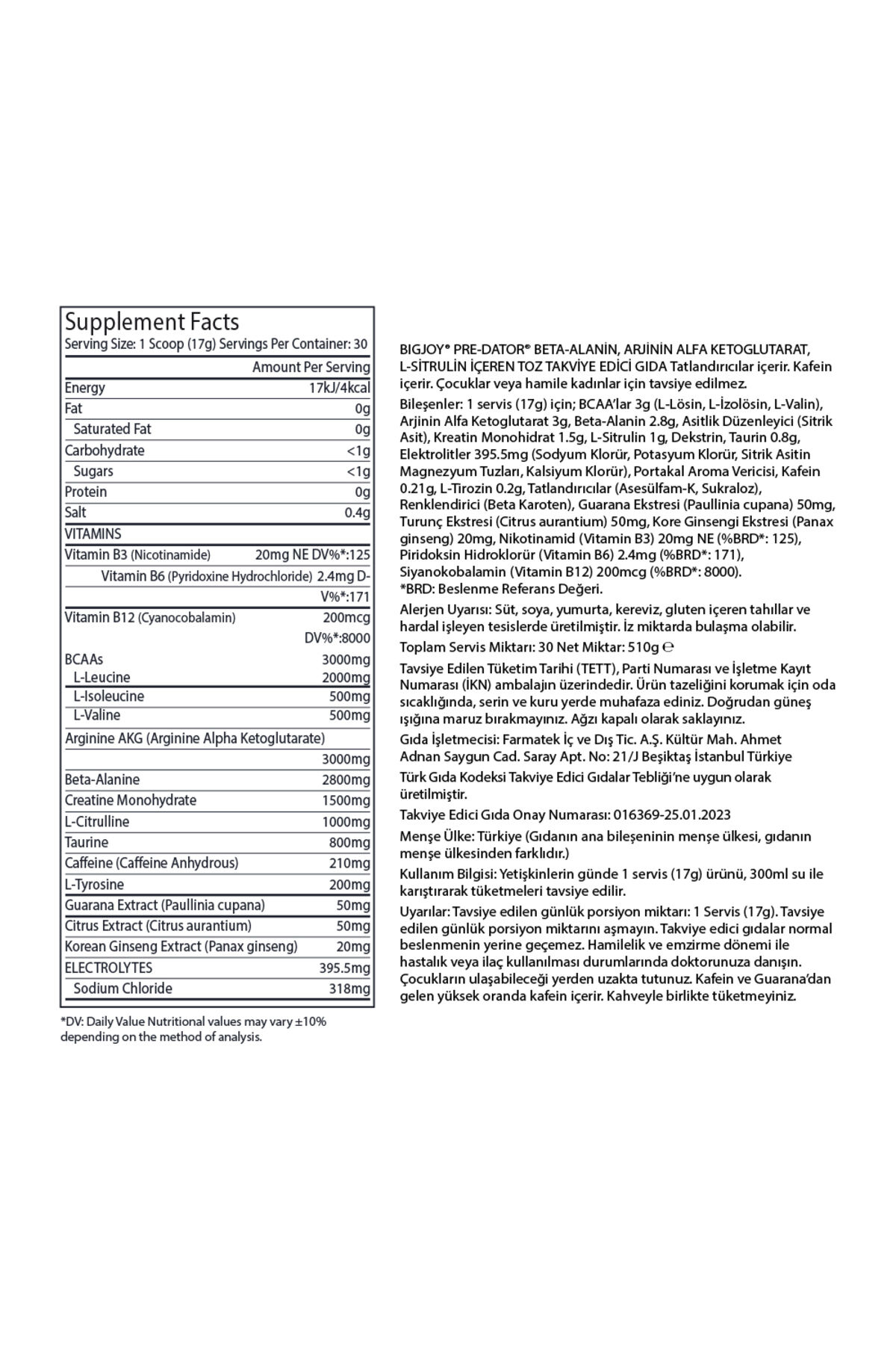 Bigjoysports Predator Pre-workout, üstün için formüle edilmiş bir pre-workout takviyesidir.;Bu preworkout, spor öncesi enerji artışı ve odaklanma sağlamak isteyenler için mükemmel bir seçimdir.; En iyi preworkout seçenekleri arasında yer alan bu ürün, içerdiği güçlü bileşenlerle dayanıklılığınızı artırır ve her antrenmanınızı daha verimli hale getirir.; Preworkout tavsiye eden sporcuların favorisi olan bu ürün, hızlı etki gösteren formülü ile sizi antrenmana hazırlayacak.; ” ,;Tek bir ölçek (17 gr) içeriğinde kas gelişimini, dayanıklılığı ve enerji seviyenizi maksimuma çıkaracak bileşenler sunar:;•4:1:1 Oranında 3000 mg BCAA: Kas onarımını ve büyümesini hızlandırır, kas yorgunluğunu azaltır.;•3000 mg Arginine AKG: Nitrik oksit üretimini artırarak kan akışını iyileştirir ve mükemmel kas pompası sağlar.;•2800 mg Beta Alanine: Antrenman sırasında yorgunluğu geciktirir, dayanıklılığı ve ı artırır.;•1500 mg Kreatin: Güç ve enerji seviyelerini yükselterek daha yoğun antrenman yapmanızı sağlar.;•1000 mg Citrulline: Kas dayanıklılığını artırır, kas ağrısını azaltır ve yorgunluğu geciktirir.;•800 mg Taurine: Enerji üretimine destek olur, kas kasılmalarını ve hidrasyonu iyileştirir.;Ek olarak, guarana, ginseng ve elektrolitler içeriğiyle enerjinizi artırır, konsantrasyonunuzu güçlendirir ve vücut dengenizi korur.;Bu bileşenler, antrenman sürenizi ve yoğunluğunuzu artırmanıza yardımcı olur.;Bigjoysports Predator Preworkout, yoğun antrenmanlarınız için mükemmel bir çözümdür.;4:1:1 oranında 3000 mg BCAA, 3000 mg Arginine AKG, 2800 mg Beta Alanine, 1500 mg Kreatin, 1000 mg Citrulline ve 800 mg Taurine gibi güçlü bileşenler içerir.;Guarana, ginseng ve elektrolitler ile zenginleştirilmiş formülü, enerji seviyenizi artırırken, dayanıklılığınızı ve ınızı en üst düzeye çıkarır.;Kas gelişimi, güç artışı ve hızlı toparlanma için ideal olan bu pre-workout takviyesi, antrenmanlarınızda fark yaratacaktır.