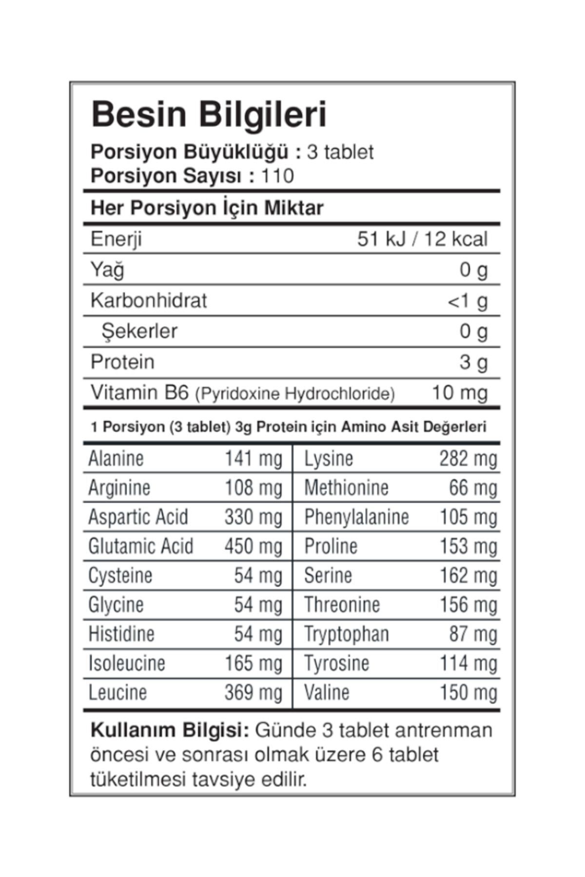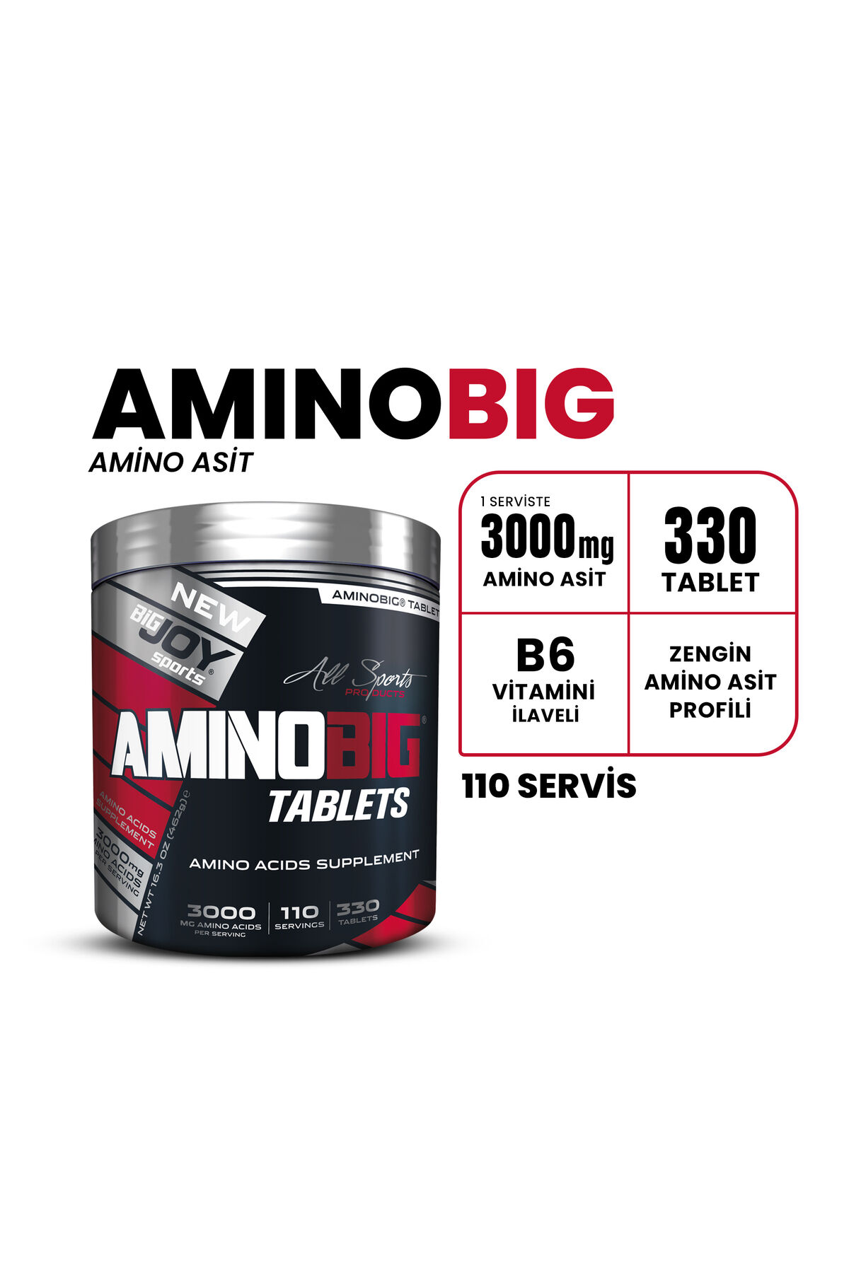 AminoBig Tablets;İçerisinde toplam 330 tablet vardır.;Her servisinde 3000 mg amino asit sunar.;Esansiyel ve esansiyel olmayan amino asitlerden oluşan zengin bir amino asit profiline sahiptir.;Sporcuların günlük amino asit ihtiyacını karşılamaya yardımcı olur.;Kullanım Bilgisi;Antrenman öncesinde ve sonrasında 3'er tablet olmak üzere günde toplam 6 tablet tüketebilirsiniz.;Bileşenler;1 servis (3tablet) için;Alerjen Maddeler : SÜT bileşeni içerir.;Yumurta, kereviz, soya, gluten içeren tahıllar ve hardal işleyen tesislerde üretilmiştir.;İz miktarda bulaşma olabilir.;Saklama Koşulu: Ürünün tazeliğini korumak için serin ve kuru yerde muhafaza ediniz.;Ağzı kapalı olarak saklayınız.