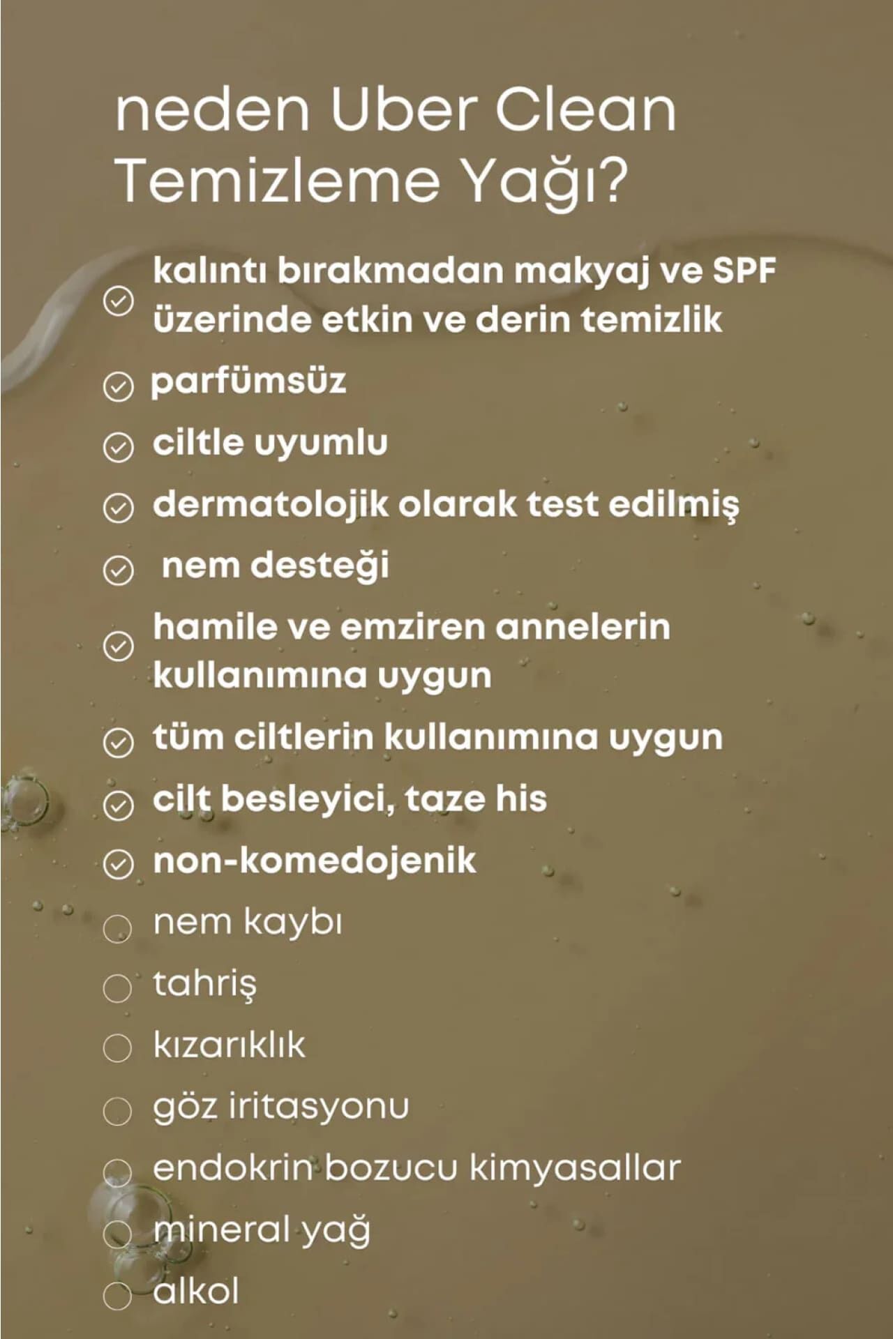 YOUR SKIN BUT BETTER RENKLİ MİNERAL GÜNEŞ KREMİ Cildinizi güneşin zararlı ışınlarından korurken cilt tonunu eşitleyerek cildinizin doğal, sağlıklı ve canlı bir görünüm kazanmasına yardımcı olur. Mineral ve gelişmiş kimyasal filtrelerin güçlü birleşimiyle UVA/UVB ışınlarına karşı etkili koruma sağlar. İçeriğindeki renk pigmentleri sayesinde hafif kapatıcılık sunar ve “makyajsız makyaj” etkisi yaratır. Cilt bakımını destekleyen formülü; nemlendirici, yatıştırıcı ve antioksidan etkili bileşenler ile geliştirilmiştir. UBER CLEAN YÜZ TEMİZLEME YAĞI Bu hafif yapılı yağ bazlı temizleyici; makyajı, güneş koruyucuları ve gün boyu biriken kirleri cilde zarar vermeden etkili şekilde çözerken, cildi aynı anda nemlendirir, yatıştırır ve besler. Bitkisel yağ esterleri ve aktif özlerle zenginleştirilmiş bu formül, cildi kurutmadan temizler, pürüzsüz ve taze bir his bırakır. Göz çevresi dahil tüm yüz için uygundur.