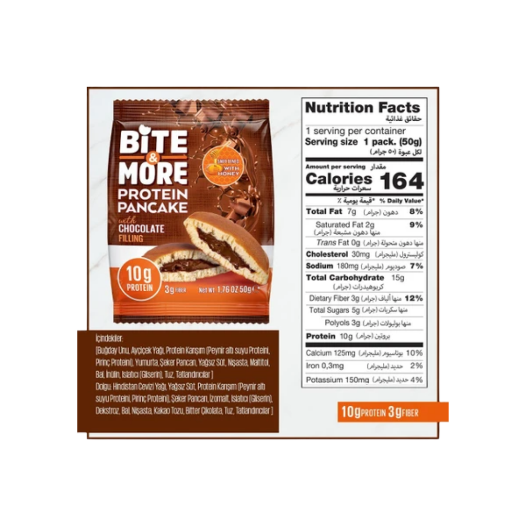 Bite & More Protein Pancake Çikolata, çikolata dolgulu, protein bakımından zengin (10g protein) ve lif içeriği (3g lif) ile dengeli bir atıştırmalık sunar. Çikolatanın eşsiz lezzetini sağlıklı bir seçenekle birleştirir. Spor sonrası enerji ihtiyacınızı karşılamak veya günün her saatinde tatlı isteğinizi gidermek için idealdir.