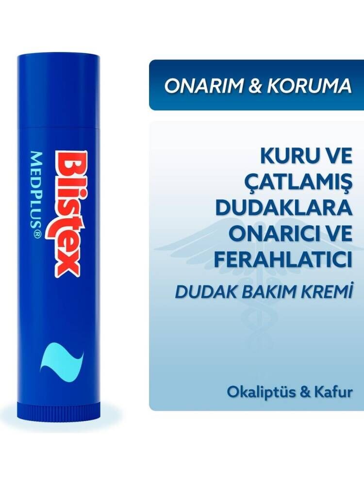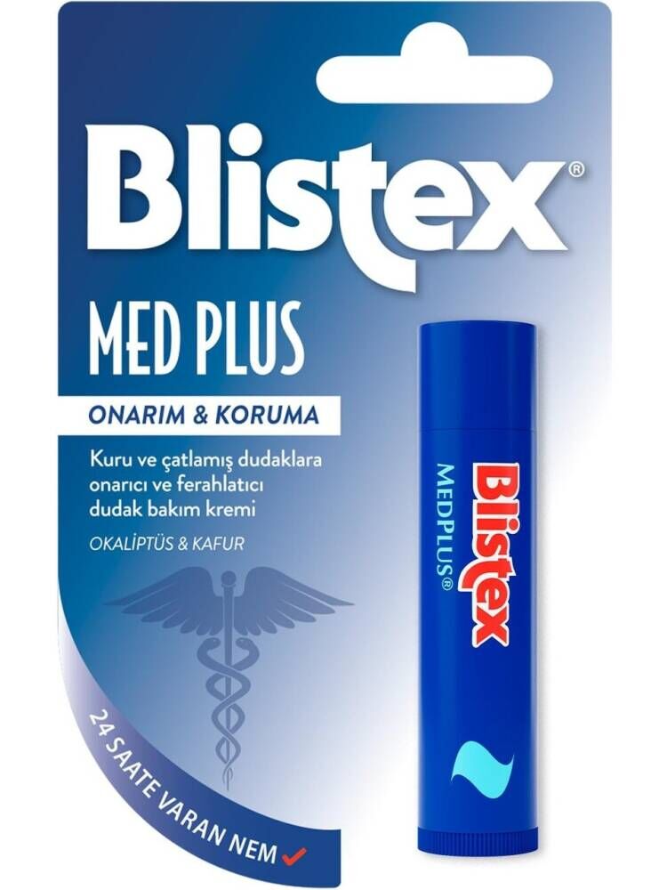 Blistex Med plus, kuru ve çatlamış dudakları hızlıca nemlendirmeye ve korumaya yardımcı olmak için özel olarak formüle edilmiştir.; İçeriğindeki Okaliptus, mentol ve kafur kurumuş ve çatlamış dudakları onarmayı ve dudakların kaybettiği nemi geri kazandırmayı destekler.; Kurumuş dudaklara ferahlatıcı bir etki sağlamaya yardımcı olur ve dudakları normal nem dengesine kavuşturmak için özel koruyucu bir bariyer oluşturmayı destekler.; Kullanım Şekli Dudaklarınıza ihtiyaç duydukça ve özellikle güneşe, soğuğa veya rüzgara çıkmadan önce uygulayınız.; Bu hava koşullarına uzun süre maruz kalacaksanız, düzenli aralıklarla uygulamayı tekrarlayınız.; Blistex Med Plus dermatolojik olarak test edilmiştir.; Uyarılar: Harici kullanım içindir.; 3 yaşın altındaki çocukların kullanımına uygun değildir.; Boyut 4,25 gr