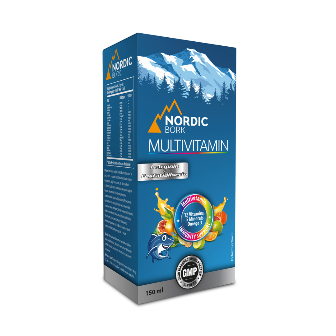 Nordic Multivitamin Doz (5 ml) L-Arginin 250 mg Fosfatidilserin 10 mg Balık Yağı 500 mg Omega 3 420 mg Vitamini C 80 mg B3 Vitamini 16 mg NE* E Vitamini 12 mg Çinko Pikolinat 7,5 mg B5 Vitamini 6 mg B2 Vitamini 1,4 mg B6 Vitamini 1,4 mg B1 Vitamini 1,1 mg Manganez 1 mg A Vitamini 500 µg RE* Folik Asit 200 µg İyot 75 µg Selenyum 55 µg Biotin 50 µg Molibden 50 µg D3 Vitamini 10 µg B12 Vitamini 2,5 µg
