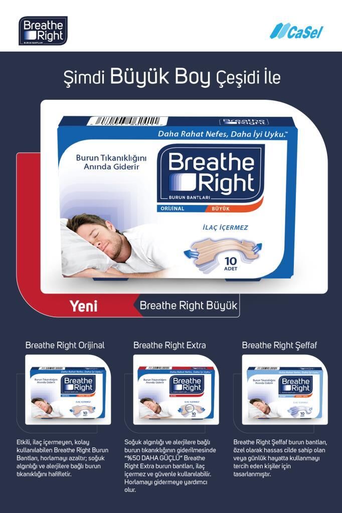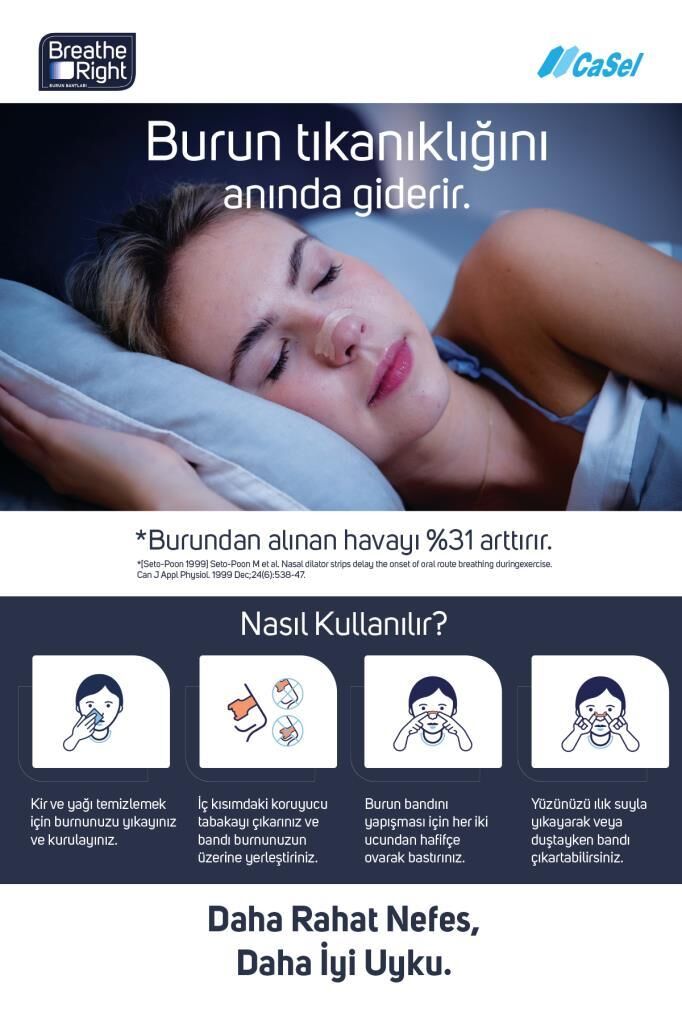 İlaç içermeyen Breathe Right® burun bantlarının daha kolay nefes alabilmeniz için burun kanallarını anında açtığı klinik olarak kanıtlanmıştır.