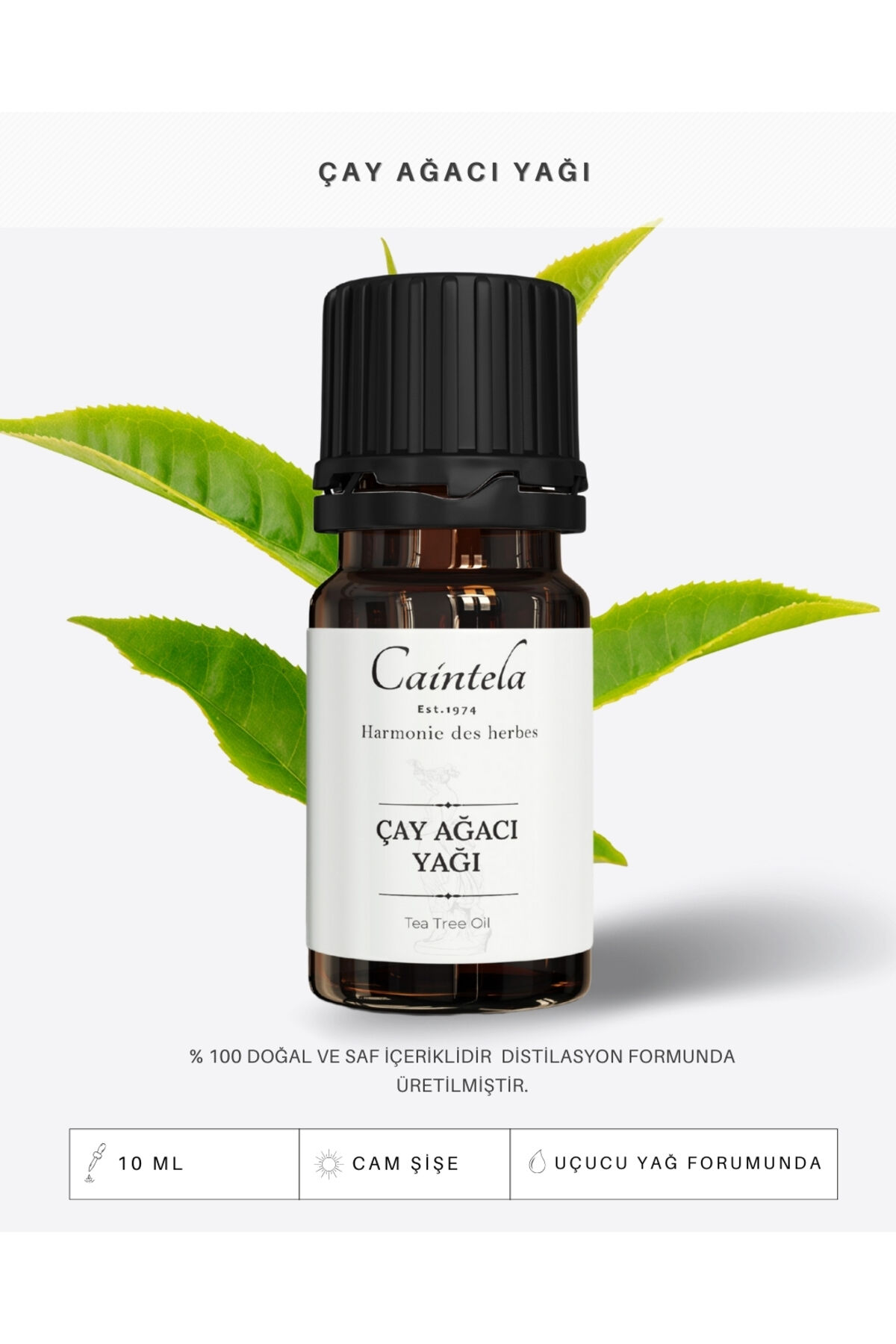 %100 doğal saf çay ağacı yağı, hacmi 10 ml olup, güvenli kullanım için uygun bir şekilde paketlenmiştir.; ; Ürünün menşei Türkiye'dir ve kalite standartlarına uygun olarak üretilmiştir.; ; Tehlikeli madde içermez; bu nedenle güvenle kullanılabilir.; ; Kullanım talimatına göre, taşıyıcı yağlarla seyrelterek harici kullanım için uygundur.; ; Çocukların erişemeyeceği yerlerde saklanması tavsiye edilmektedir.; ; Gözle ve mukoza ile temasından kaçınılmalı; temas halinde bol su ile durulanmalıdır.; ; İthalatçı/yetkili temsilci/hizmet sağlayıcısı olarak Caintela, ürünlerinizi sorunsuz bir şekilde teslim almanızı garanti eder.; ; Ürünümüz Sağlık Bakanlığı Ürün Takip Sisteminde 8684759990007 barkod numarası ile kayıtlı ve onaylıdır.