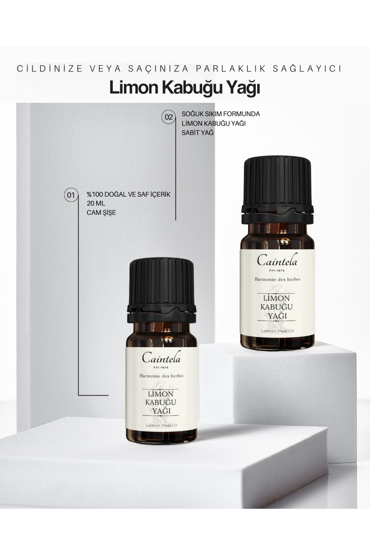 - %100 doğal ve saf limon kabuğu yağı, cildinize ve saçınıza parlaklık kazandırır.; - 20 ml hacmiyle pratik kullanım sunar; evde veya seyahatte kolayca yanınızda taşıyabilirsiniz.; - Sabit yağlarla karıştırılarak cilde uygulandığında, doğal bir bakım deneyimi yaşatır.; - Çocukların ulaşamayacağı yerlerde saklanması önerilir, güvenli kullanım için önemlidir.; - TR menşeili olup Caintela tarafından üretilmiştir; kaliteyi ve güveni temsil eder.; - Tehlikeli madde içermeyen formülüyle güvenle kullanabilirsiniz; cilt ve saç bakımı için idealdir.; - Cilt veya saçınıza uygulandığında hoş bir koku yayarak aromaterapi etkisi yaratır.