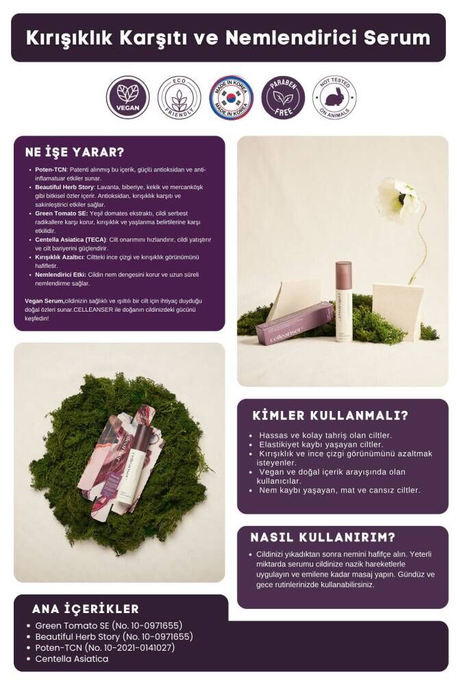 CELLEANSER VEGAN CLEAN SERUM 30 ML NEDİR? NE İŞE YARAR? ; Celleanser serumu hassas cildi sakinleştirir.; ; Dış tahriş nedeniyle strese giren ciltler için rahatlatıcı bir kontrol serumu ile güçlü elastikiyet sağlar.; ; Zayıf ve hassas ciltler için elastikiyeti güçlendirir.; ; Kırılgan ve hassas cildi yumuşatıp güçlendirebilen besleyici bir serumdur ve düşük tahrişle bile zengin beslenme sağlayarak kırışıklıkların iyileşmesine yardımcı olur.; ; Sıkı ve elastik dokusuyla rahatlatıcı etkiler ortaya çıkarır.; ; Kore Vegan Sertifikası Alınmıştır.; ; Celleanser vegan serisi Kore vegan sertifikasıyla güvenilebilecek ve kullanılabilecek bir üründür.; ; Hassas ciltlerde güvenle kullanır.; ; Hipoalerjenik, paraben içermeyen ve ağır metallere yönelik 23 anti-alerjik testi tamamladık, bu nedenle hassas cildi olan herkes bunu güvenle kullanabilir.; ; Kullanım Talimatı: Herhangi bir anormal semptom veya kırmızı lekeler, şişlik gibi yan etkiler varsa bir uzmana danışın.; Çocukların erişemeyeceği, güneş ışığından uzak serin ve kuru yerde muhafaza ediniz.; Gözle temasından sakınınız.; Gözle teması halinde bol su ile yıkayınız.; Kullanım amacı dışında hiçbir maksatla kullanmayınız.; ; Skt: 25.10.2025